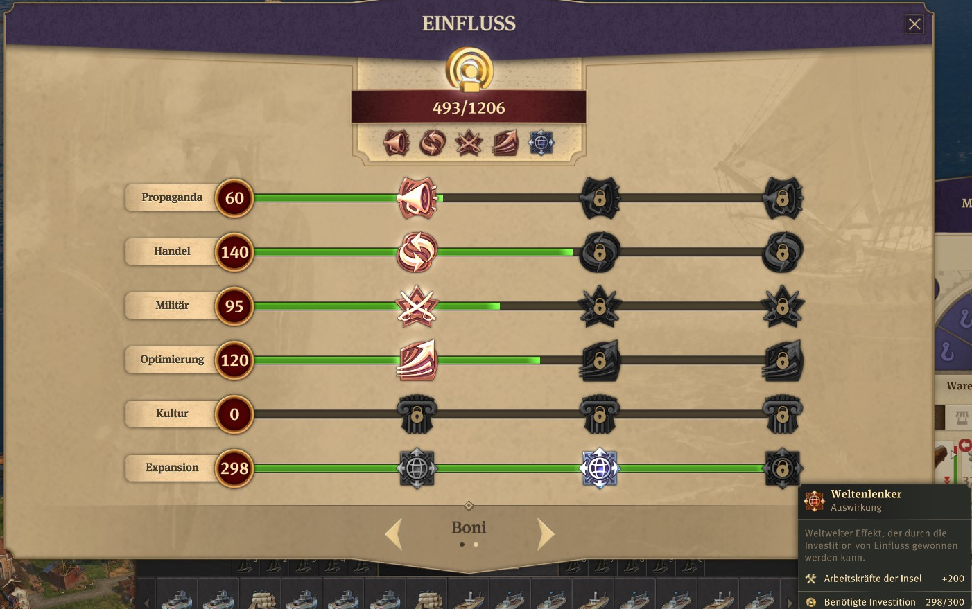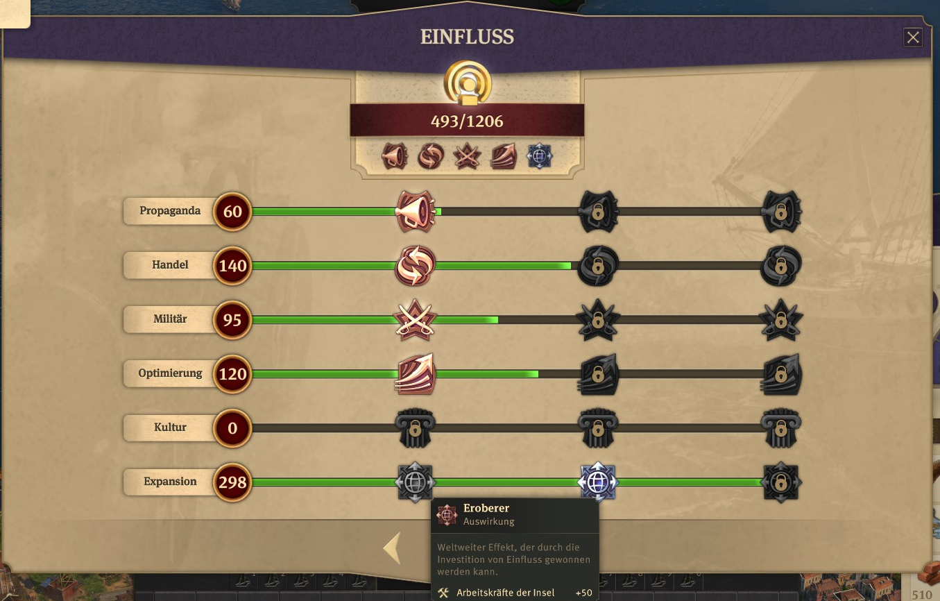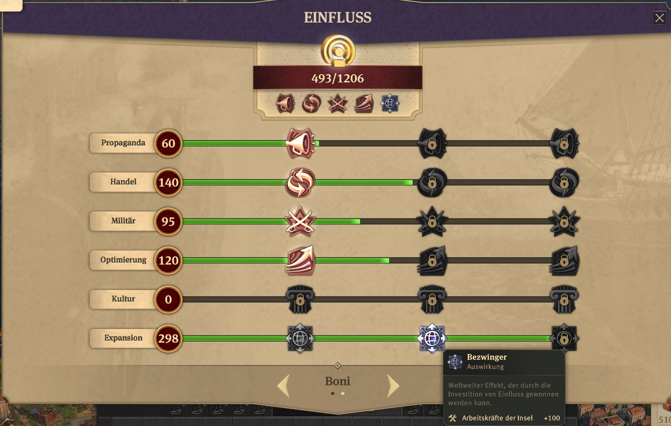 Ergibt dann 308 investierten Einfluss = +200 Arbeiter jeder Bevölkerungsstufe für jede Insel.