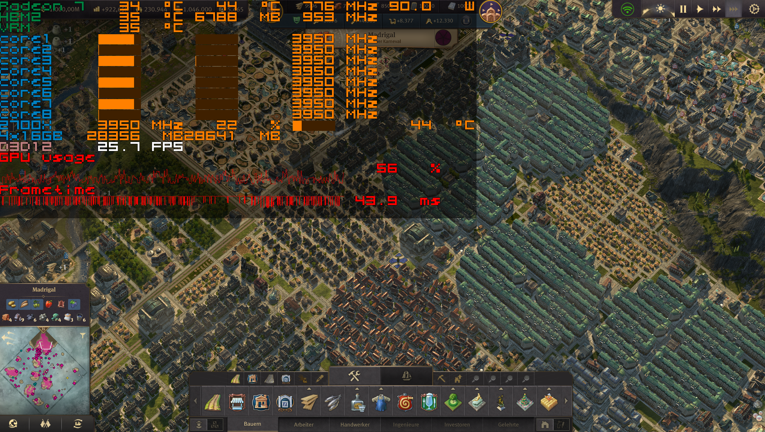 In diesem Beispiel mit meinen Settings sinken die FPS nur durch anklicken eines Investorenhauses(NPC Benachrichtigungen machen das gleiche), von ca32 auf ca27FPS ....grob 15% Verlust!