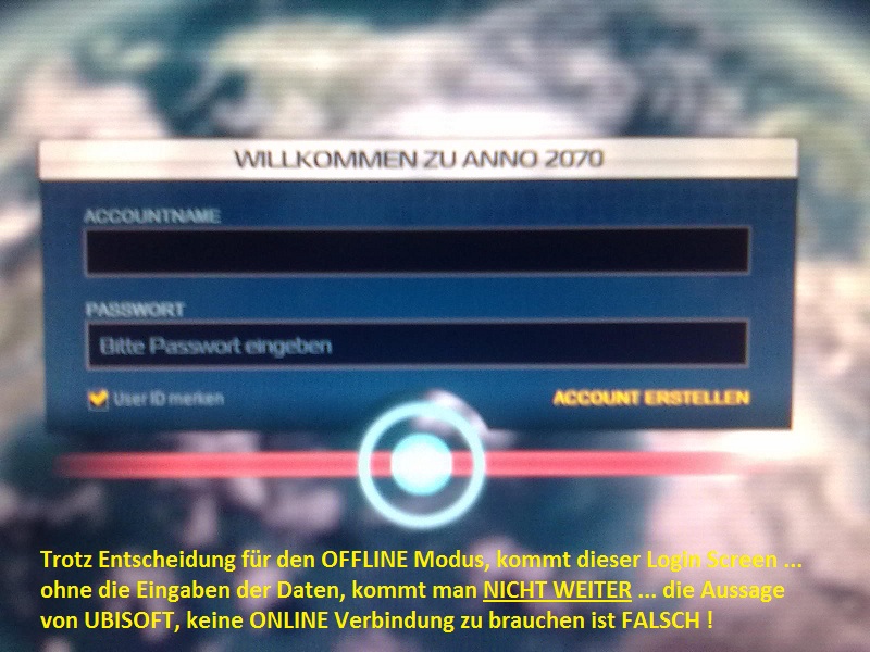 also wird doch entgegen der Aussage von UBISOFT eine ONLINE-Verbindung benötigt !). Dann kann gespielt werden.