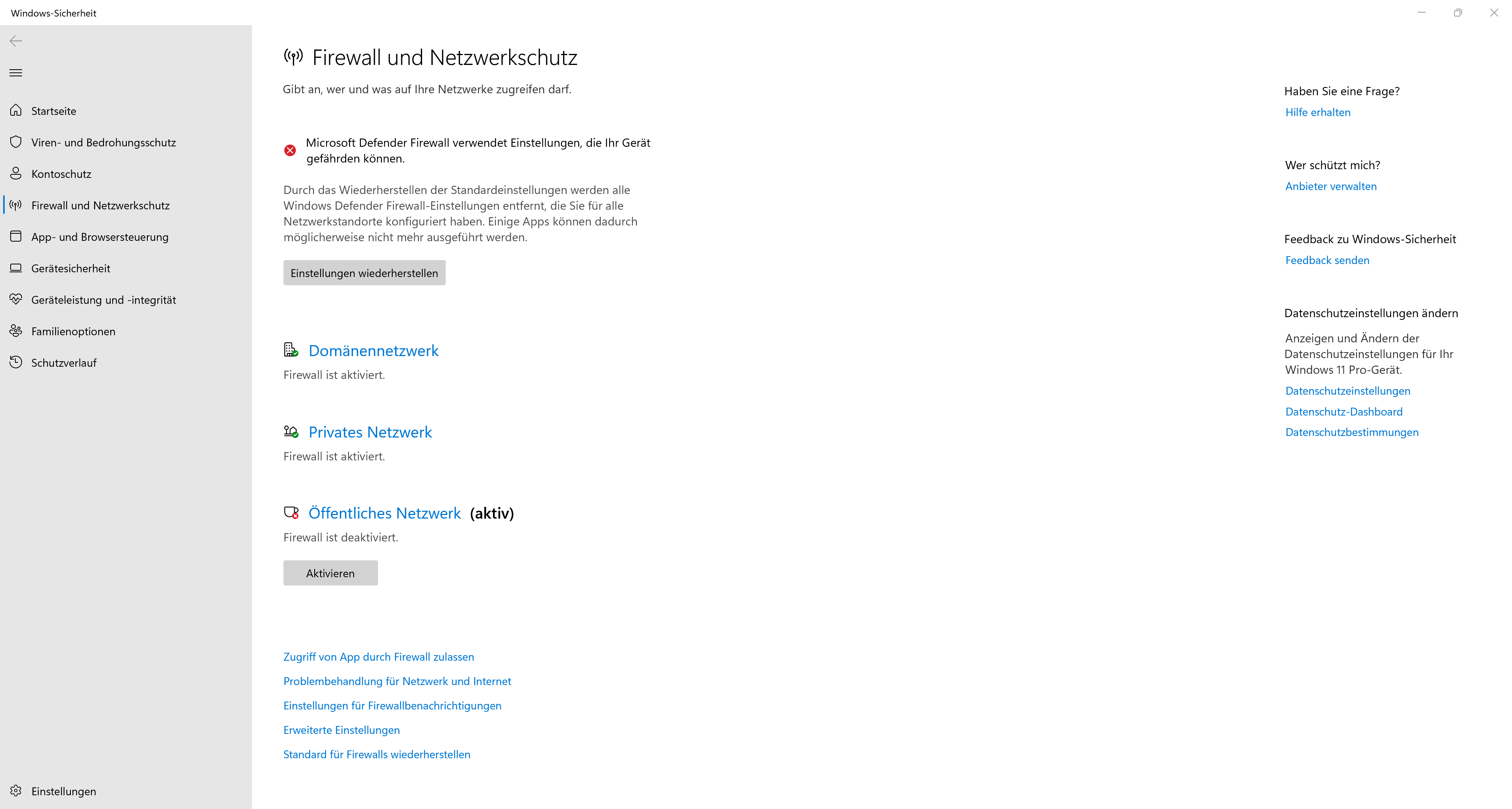 "Gast und öffentliches Netzwerk" ist aktiv und ich finde gerade diesen Switch nicht (wenn es überhaupt einer ist), um auf "Privat" umzustellen