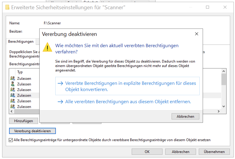 kann nicht entfernt werden, da dieses Objekt übergeordnete Berechtigungen übernimmt. Wenn Sie "Office(Home\Office)" entfernen möchten, müssen Sie verhindern, dass diesem Objekt Berechtigungen vererbt werden.Deaktivieren Sie die Option zur Übernahme von Berechtigungen,und versuchen Sie dann, "Office(Home\Office)" zu entfernen.