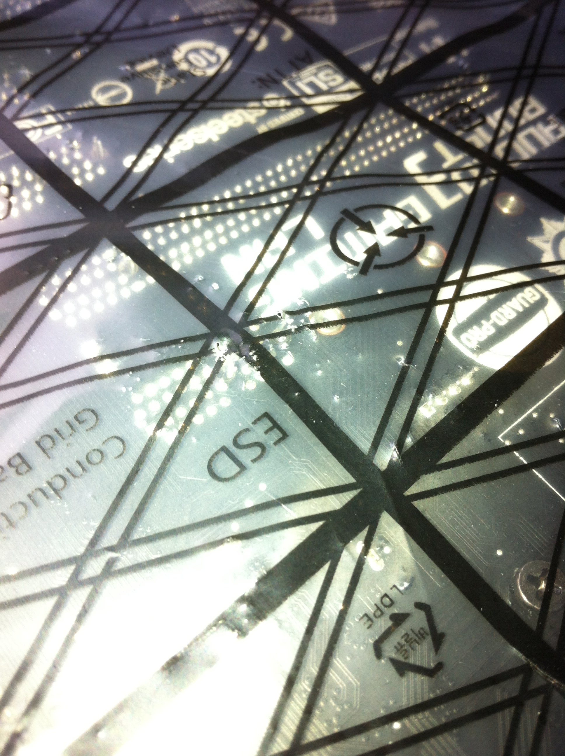 Der Umkarton vom Board sieht einwandfrei aus. Aber die Folie innen weißt zahlreiche kleine Löcher und "kleine Dellen" auf. An der Unterseite ist ein Befestigungspin vom PCI-E Port leicht verbogen, dieser hat auch den darunterliegenden Karton zerkratzt. Sonst sieht das Board völlig ok aus, keine Kratzer oder ähnliches zu erkennen.