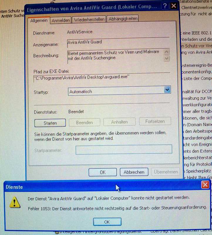 Der Dienst "Avira AntiVir Guard" auf "Lokaler Computer" konnte nicht gestartet werden.