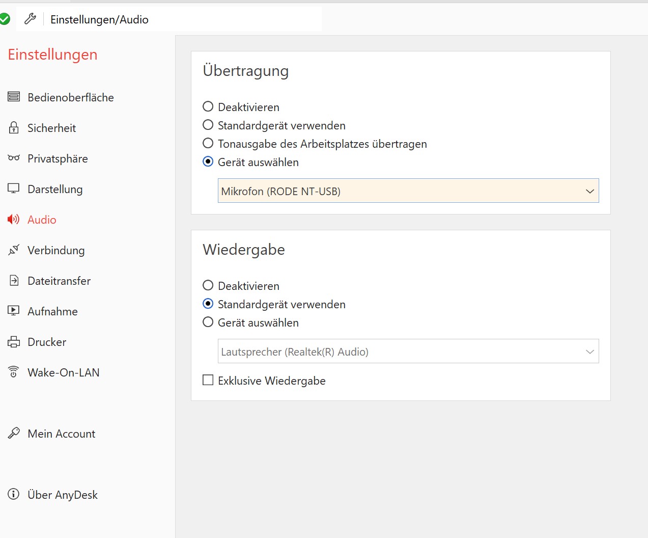 ich schaffe es leider nicht das mein Rode NT-USB auf dem anderen PC per Anydesk übertragen wird.