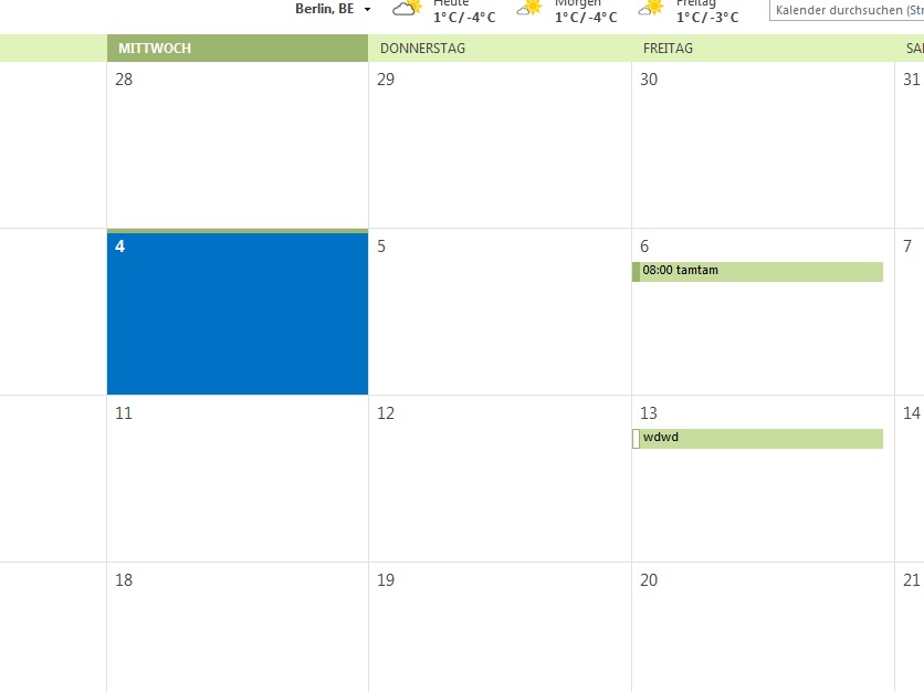 Wenn ich dann von "E-Mail" in "Kalender" wechsle, werden die vorhandenen Termine aber angezeigt.