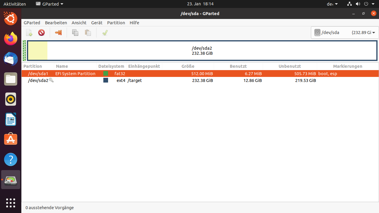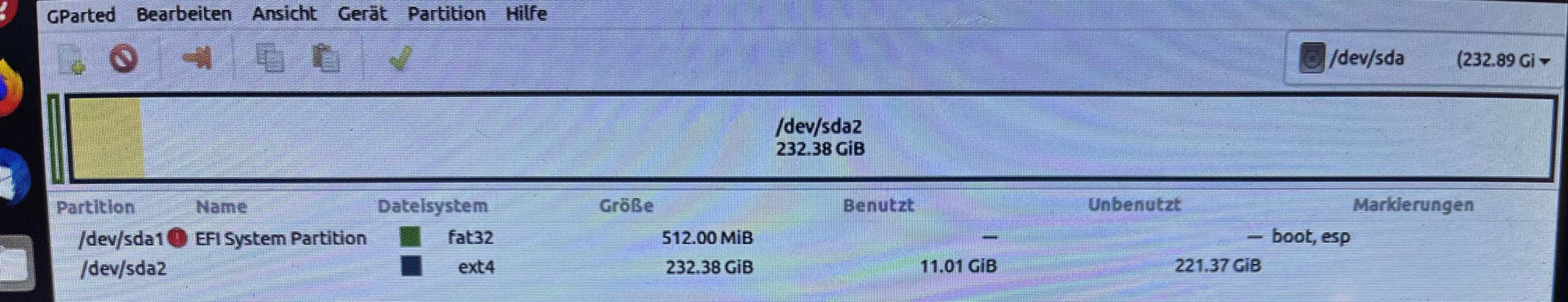 /dev/sda2 1050624 488396799 487346176 232,4G Linux-Dateisystem