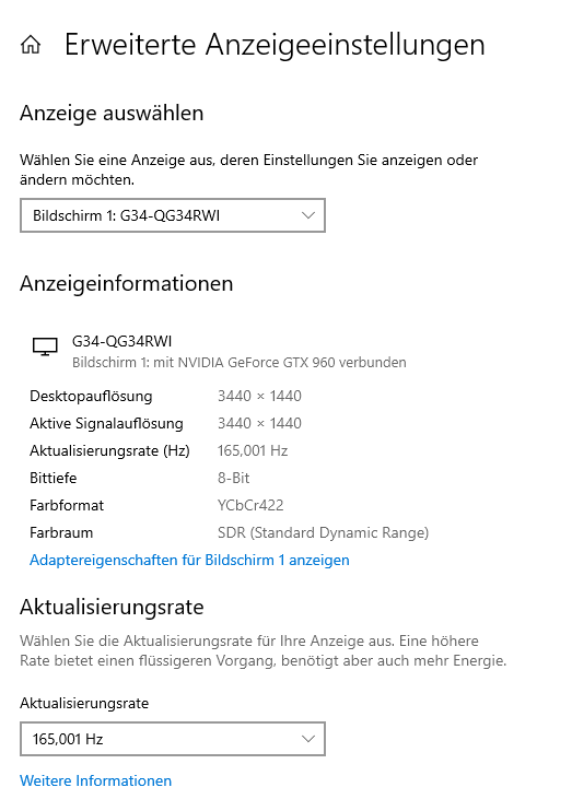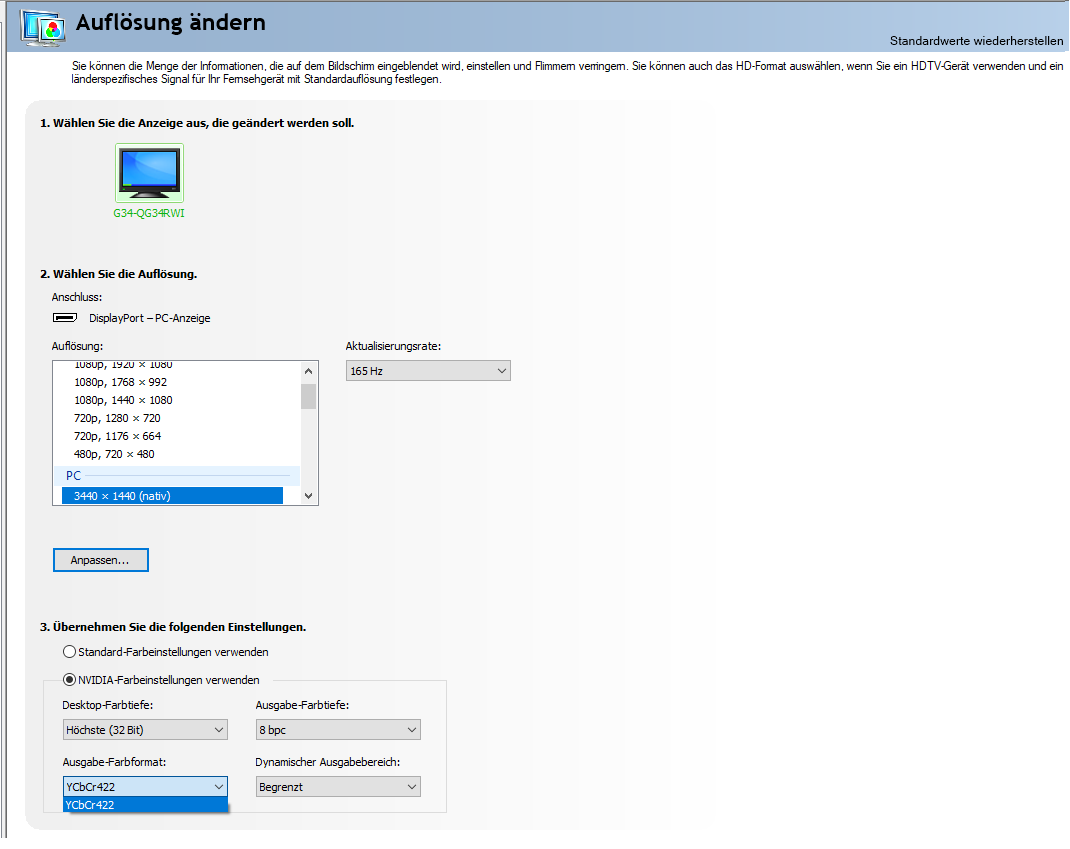 Wenn ich den Monitor über Displayport anschließe passt soweit alles. Allerdings kann ich das Farbformat einfach nicht ändern. Ich bekomme kein RGB und 10 Bit hin. Immer nur dieses sinnlose YCbCR-Format. Der Monitor selber kann natürlich 10 Bit und RGB.