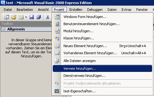 Darauf kannst du dann einen Verweis hinzufügen. (müsste bei den COM Komponenten dabei sein)