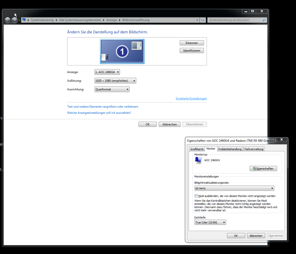 Ich hab den Monitor per DVI an meine GraKa (RX 480 Red Devil) angeschlossen, den Treiber von der mitgelieferten CD vom Monitor installiert (Aktuellerer Treiber als wenn ich ihn über die Internetsuche installieren lasse).