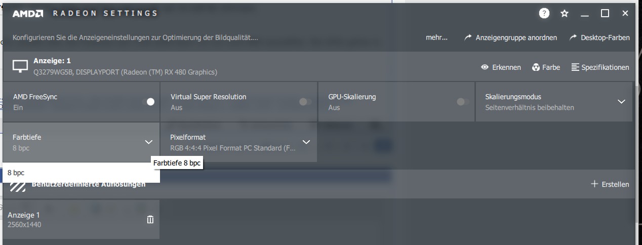 Seit Umstellung auf 75Hz ist nun aber die Farbtiefe nur noch 8 Bit anstelle von 10 Bit. Bei 60Hz geht auch 10Bit.