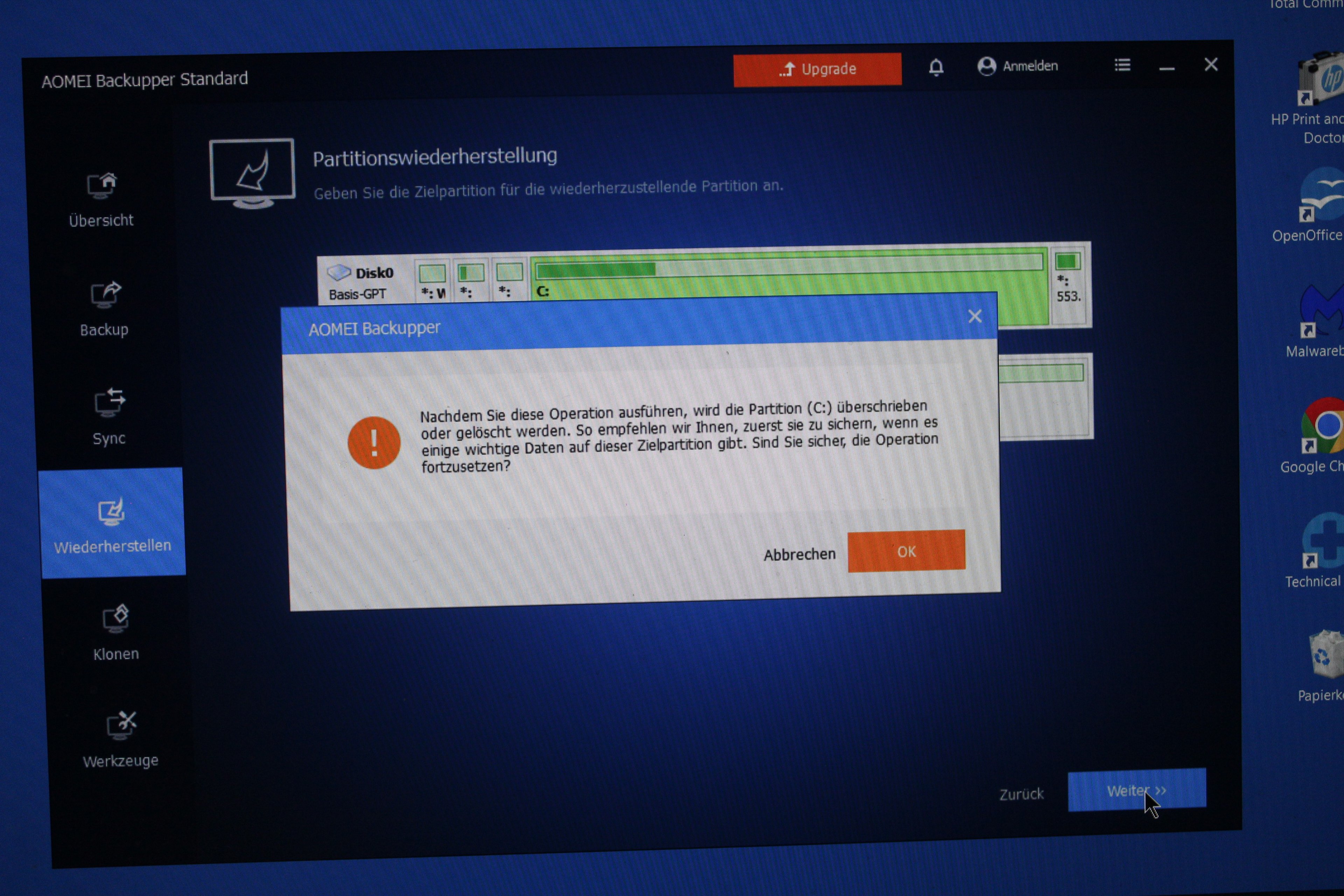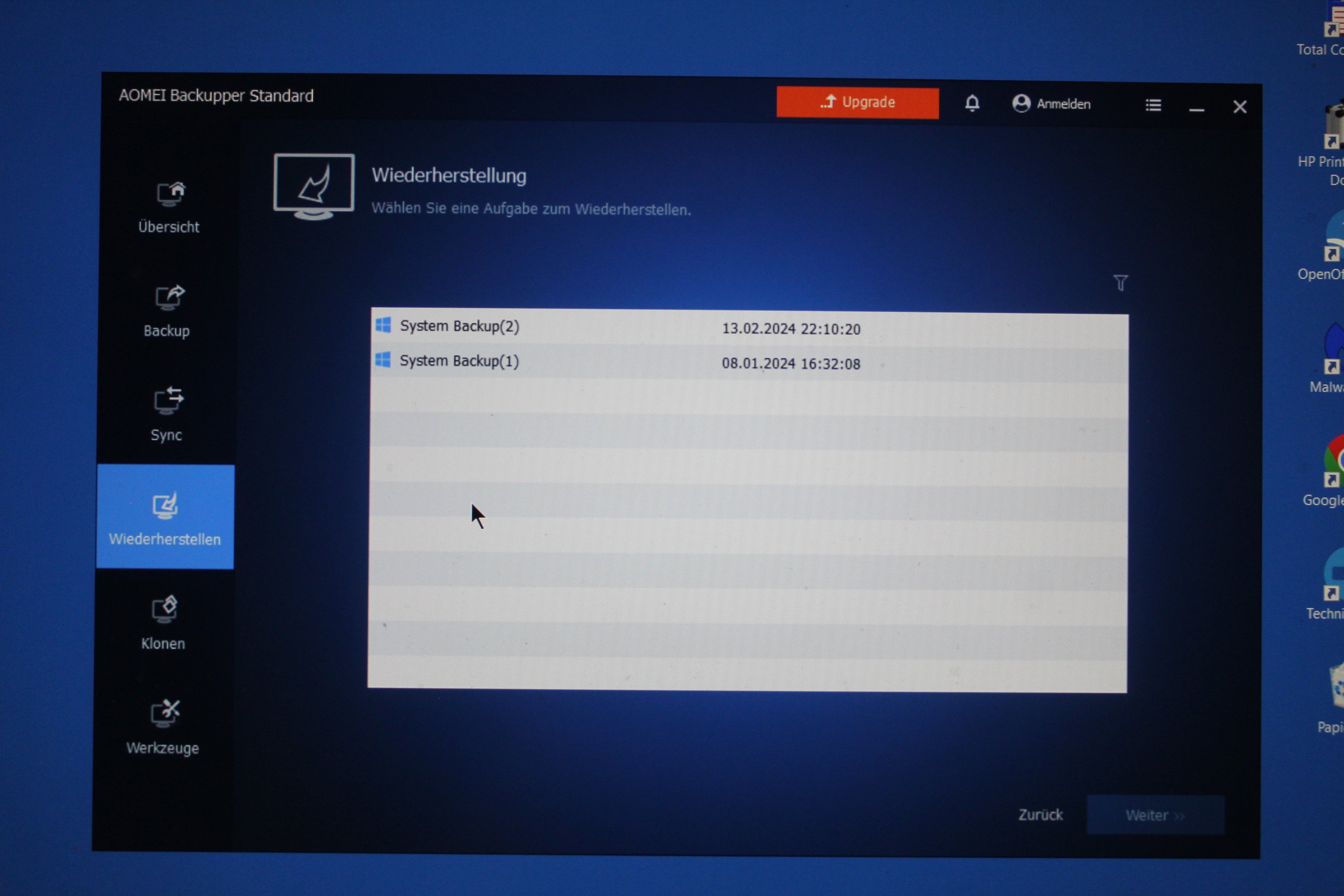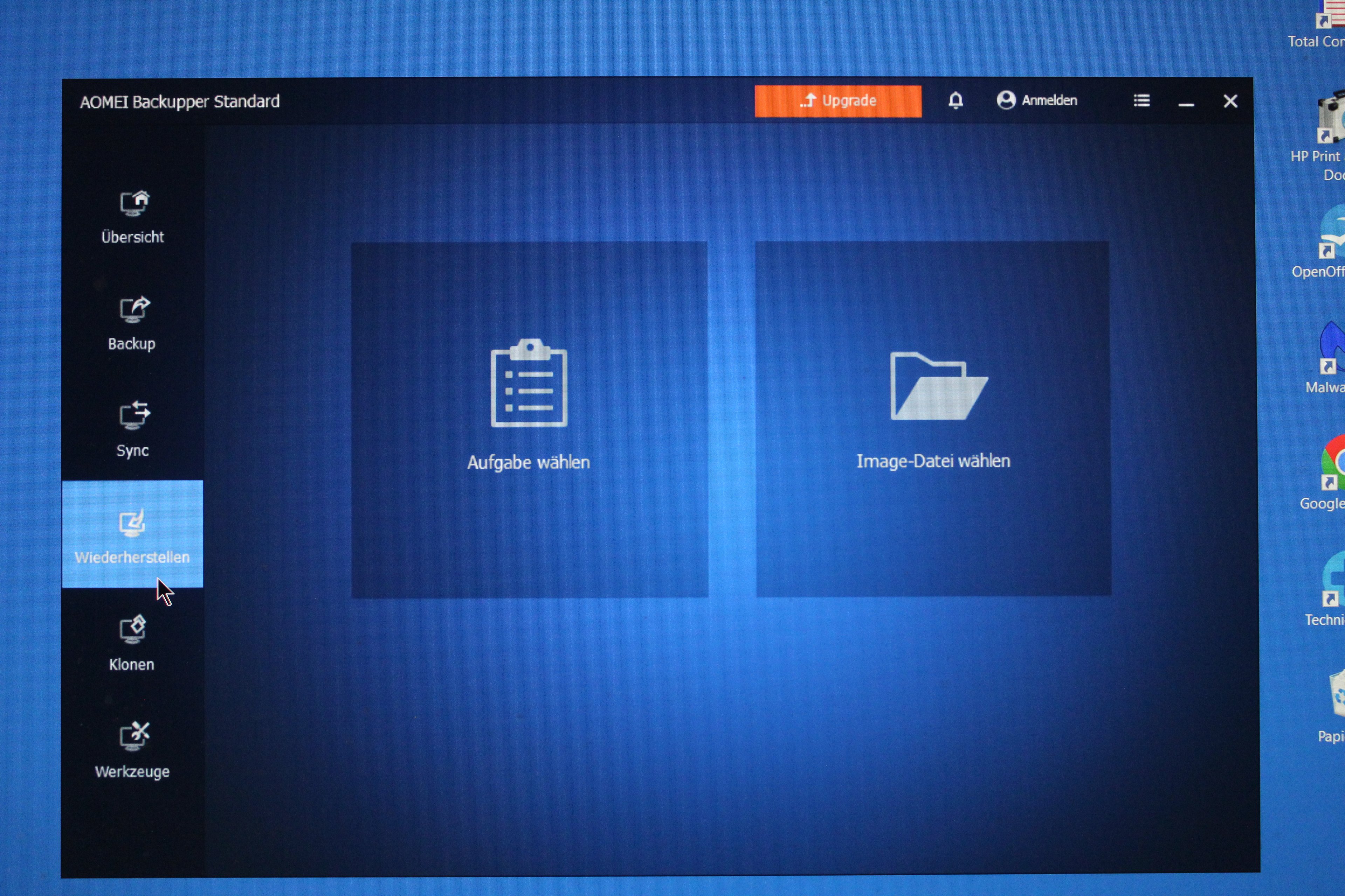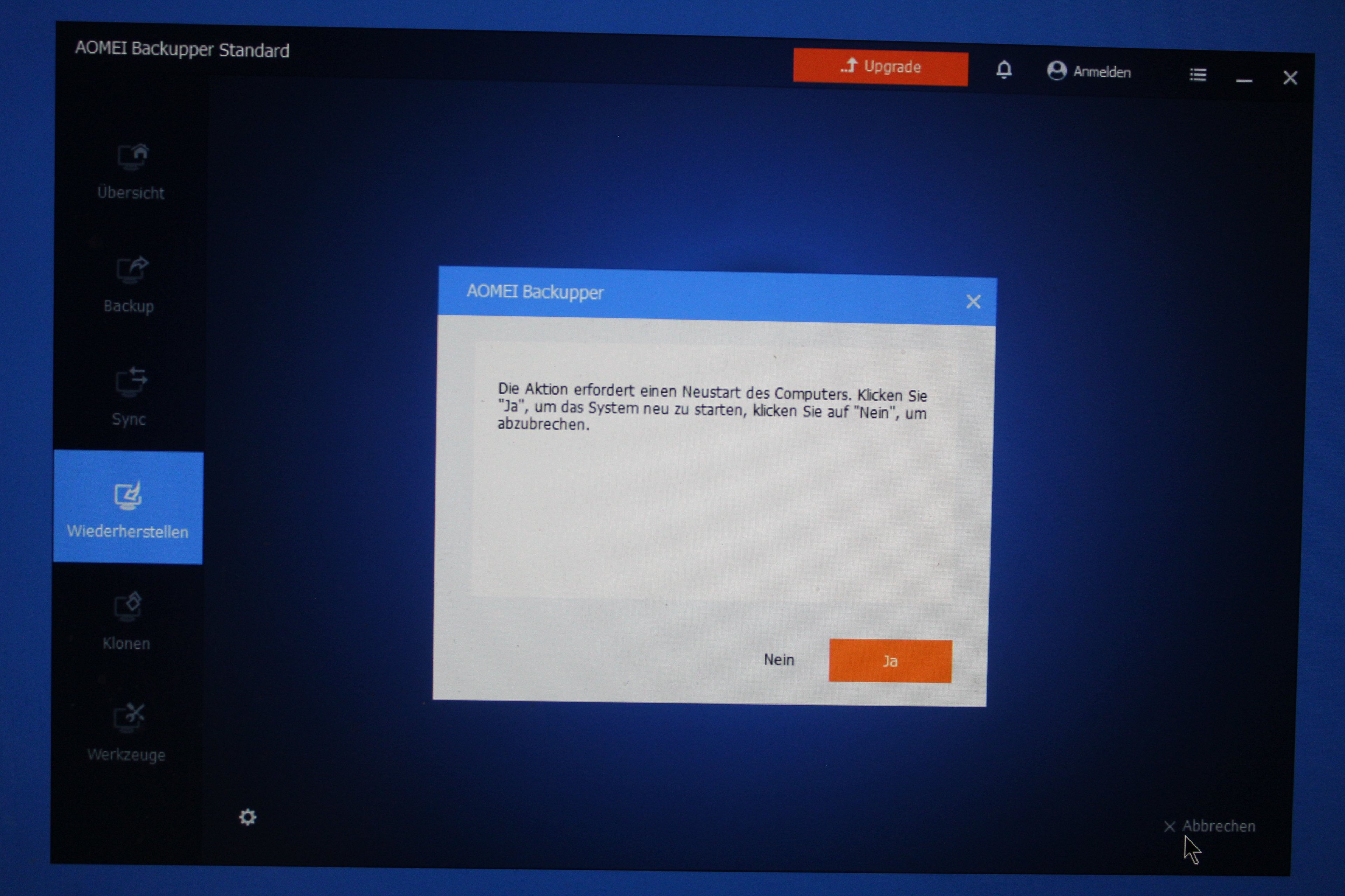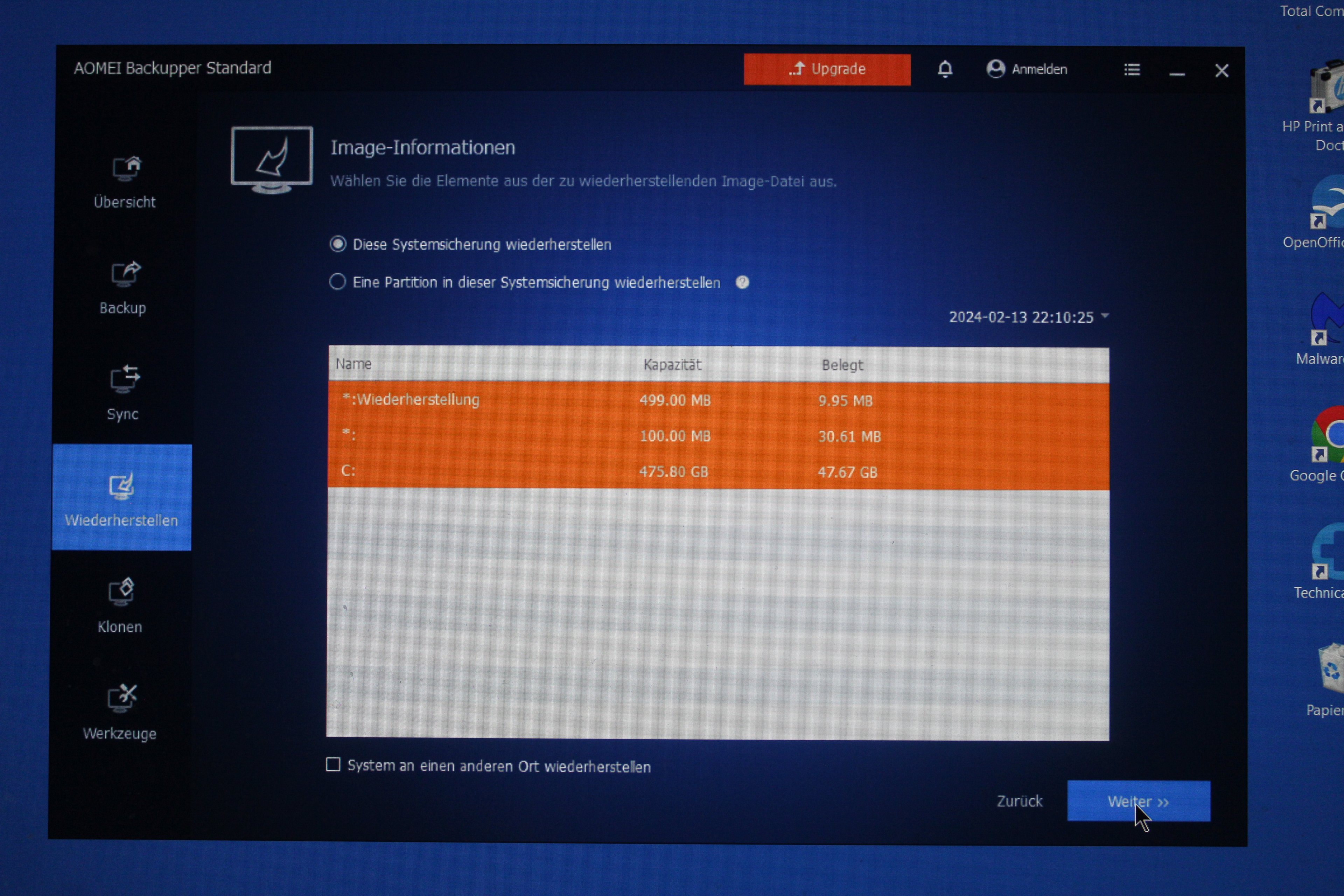 Nun hat sich das System wieder so verhakt, dass ich keine andere Möglichkeit sehe, als das Backup mit AOEIMI Backupper wieder herzustellen. Das läuft dann folgendermaßen ab (Entschuldigung für die vielen Bilder, ist aber besser als 1000 Worte):