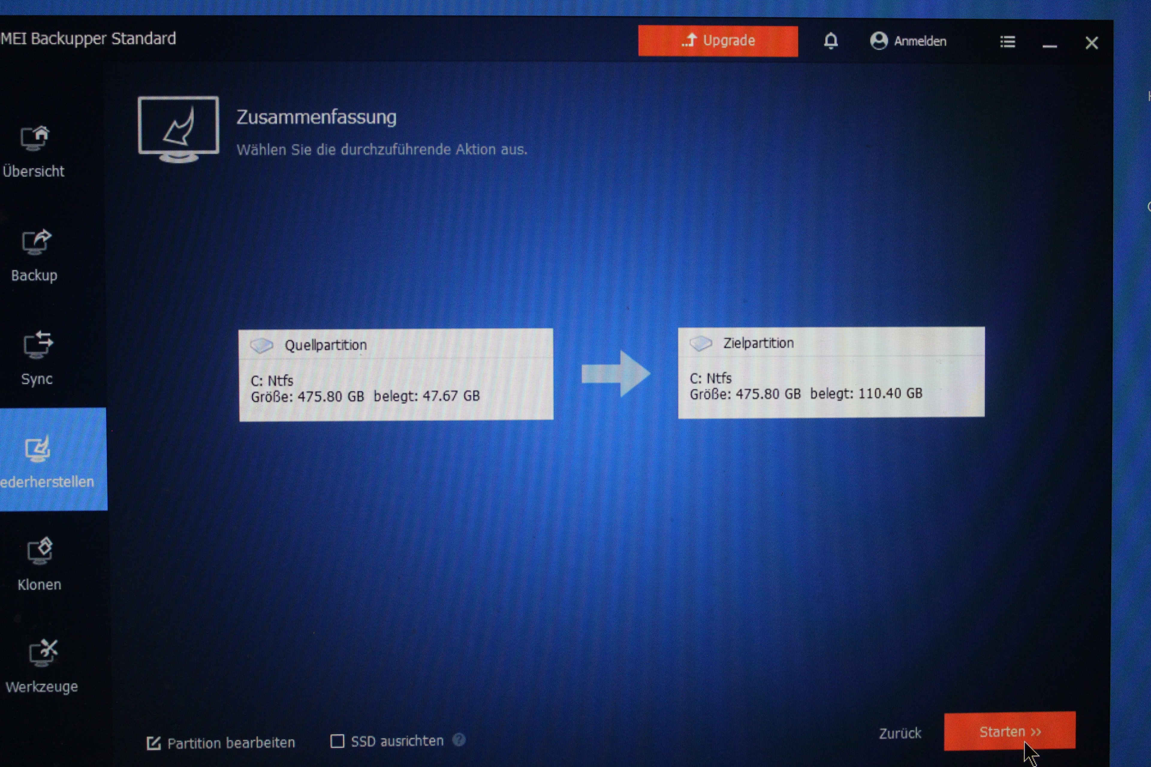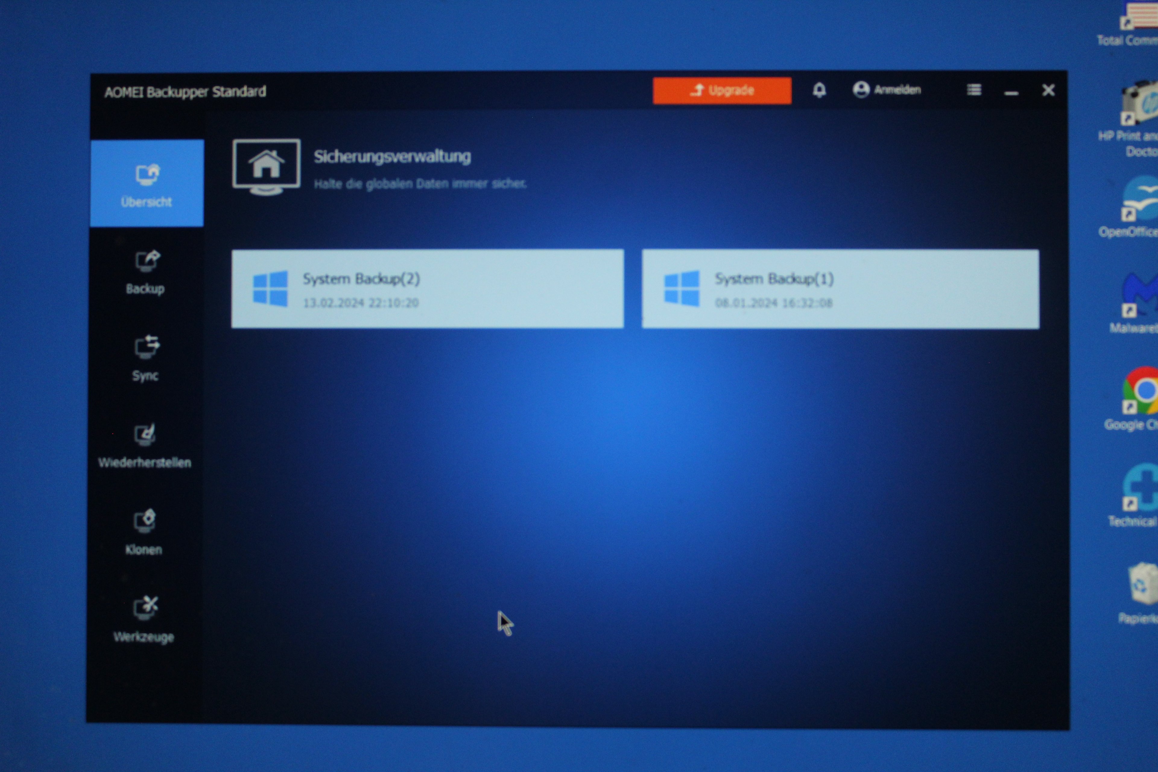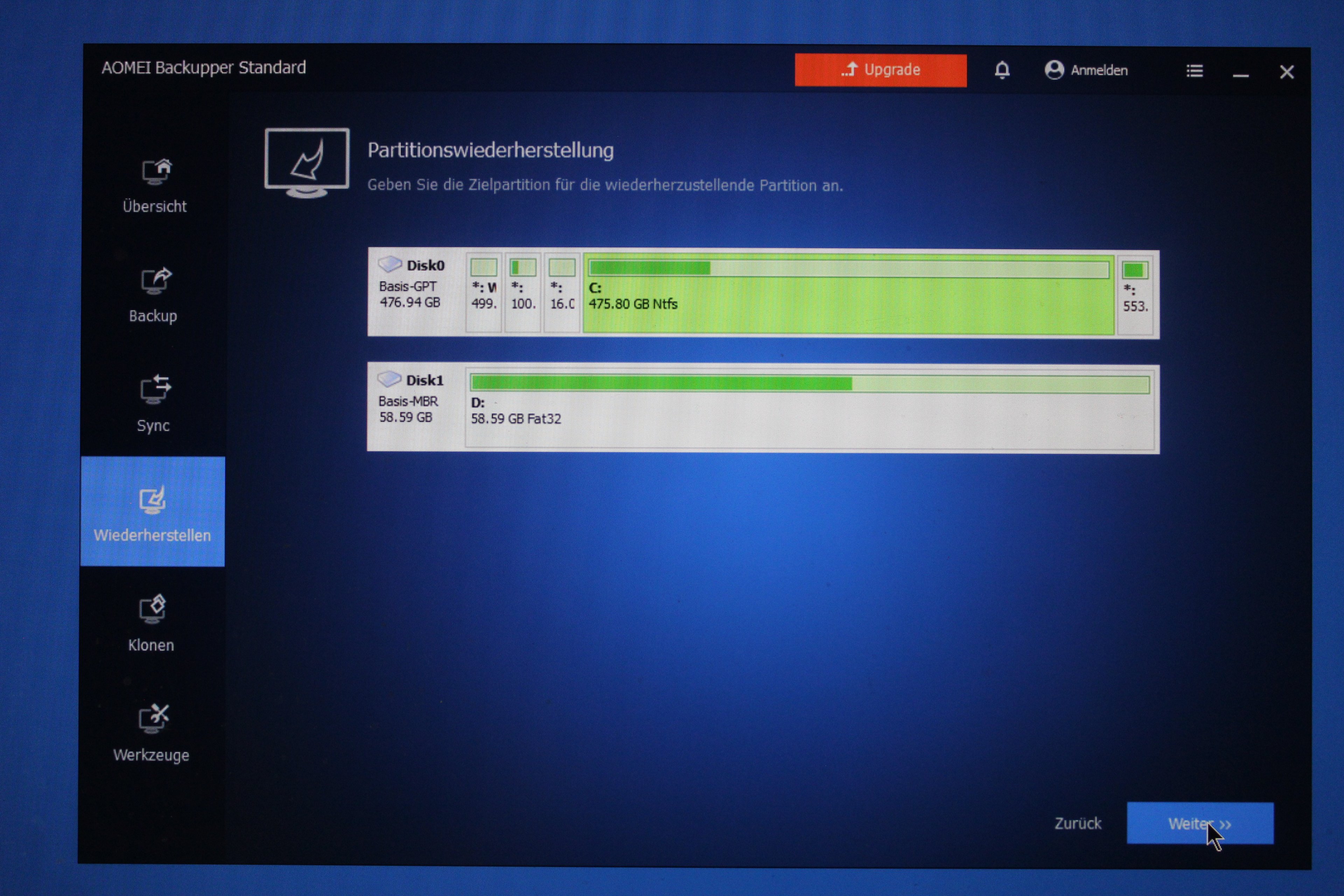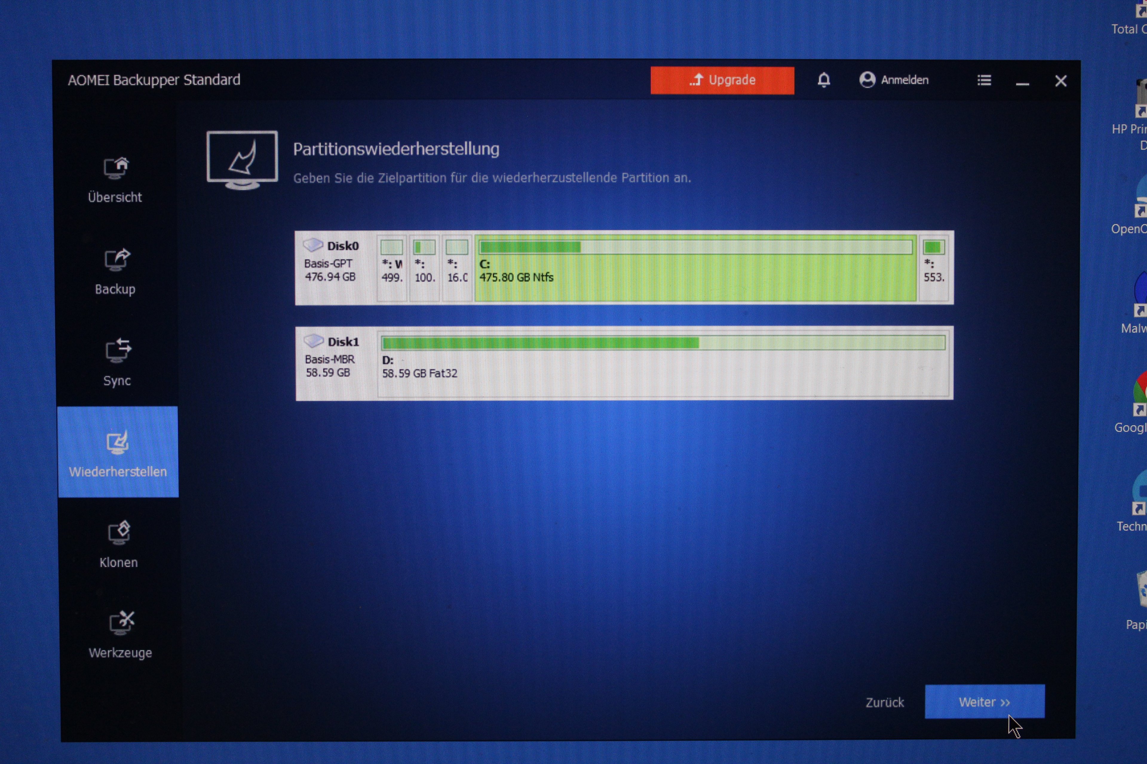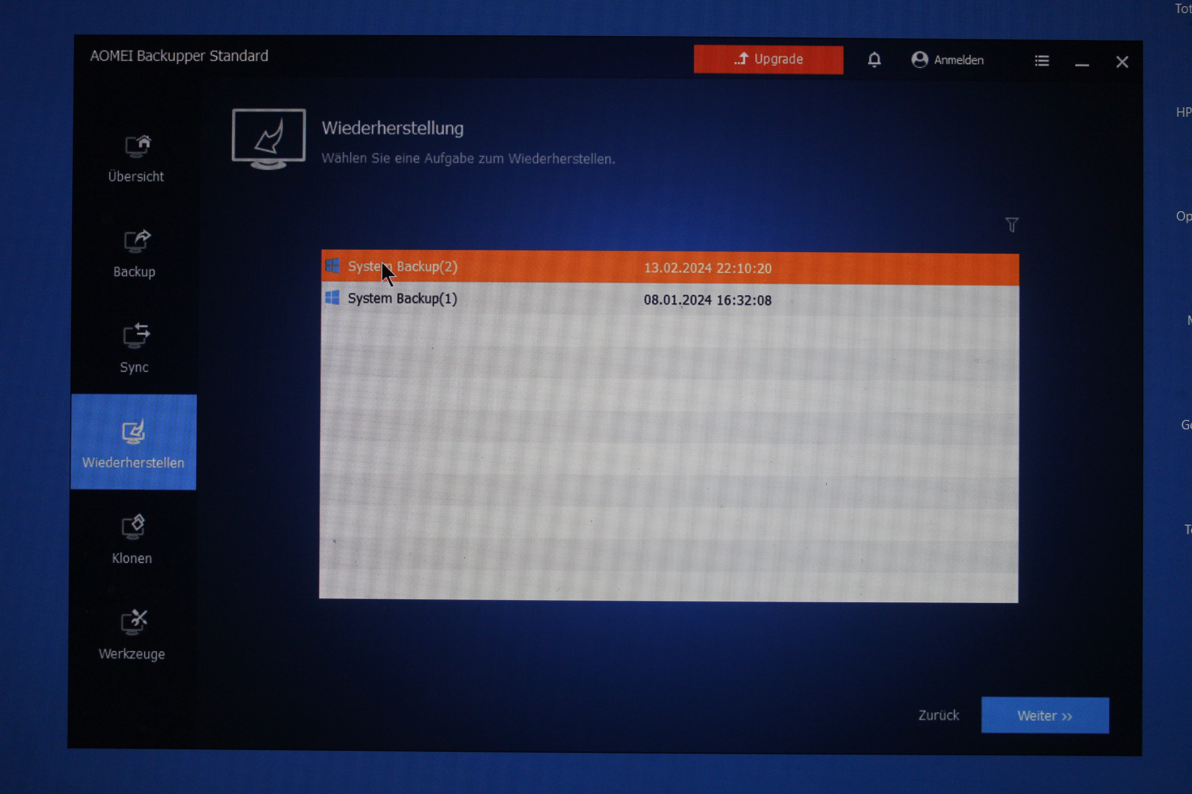 Nun hat sich das System wieder so verhakt, dass ich keine andere Möglichkeit sehe, als das Backup mit AOEIMI Backupper wieder herzustellen. Das läuft dann folgendermaßen ab (Entschuldigung für die vielen Bilder, ist aber besser als 1000 Worte):