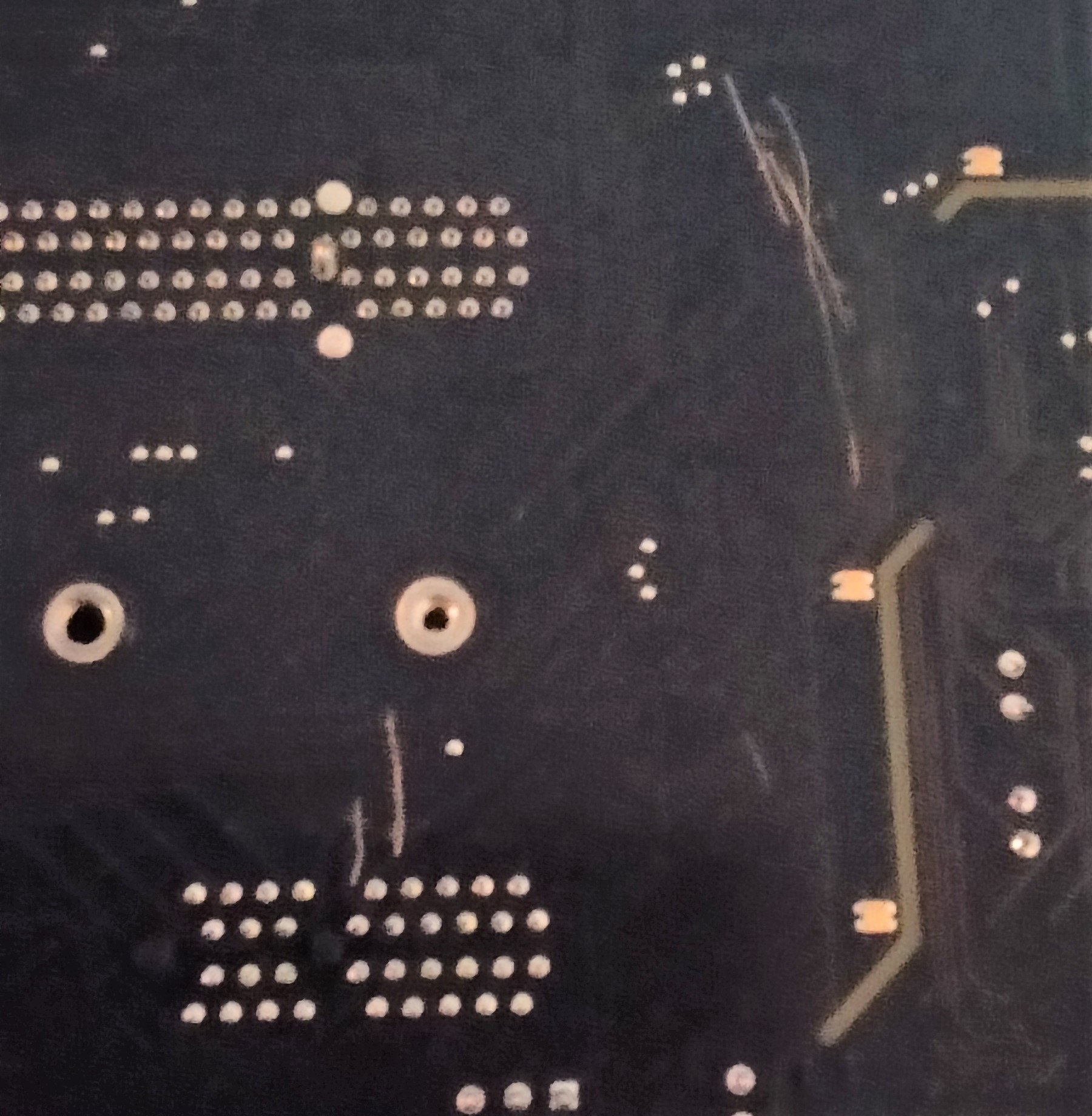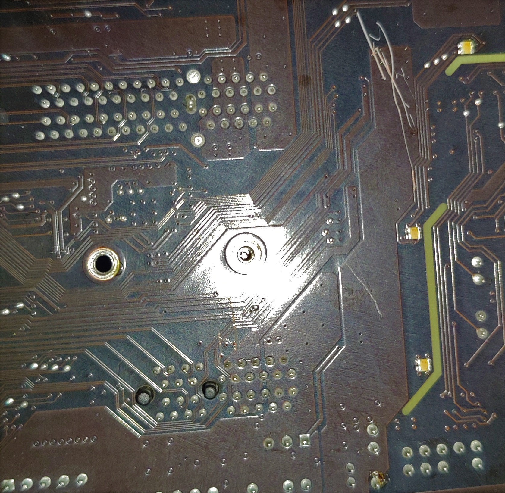 Das Board ist leider gebraucht gekauft. Deshalb hab ich es vor dem Zusammenbauen genau auf Schäden untersucht. Leider bin ich auch fündig geworden. Wie auf dem Bild zusehen sind kratzer auf der Rückseite unten rechts zusehen, die auch leicht Kupfer erkennen lassen. Vor dem Zusammenbauen habe ich das Board einzeln kurz laufen lassen um sicherzugehen das es nirgends raucht oder es einen Kurzen hat.