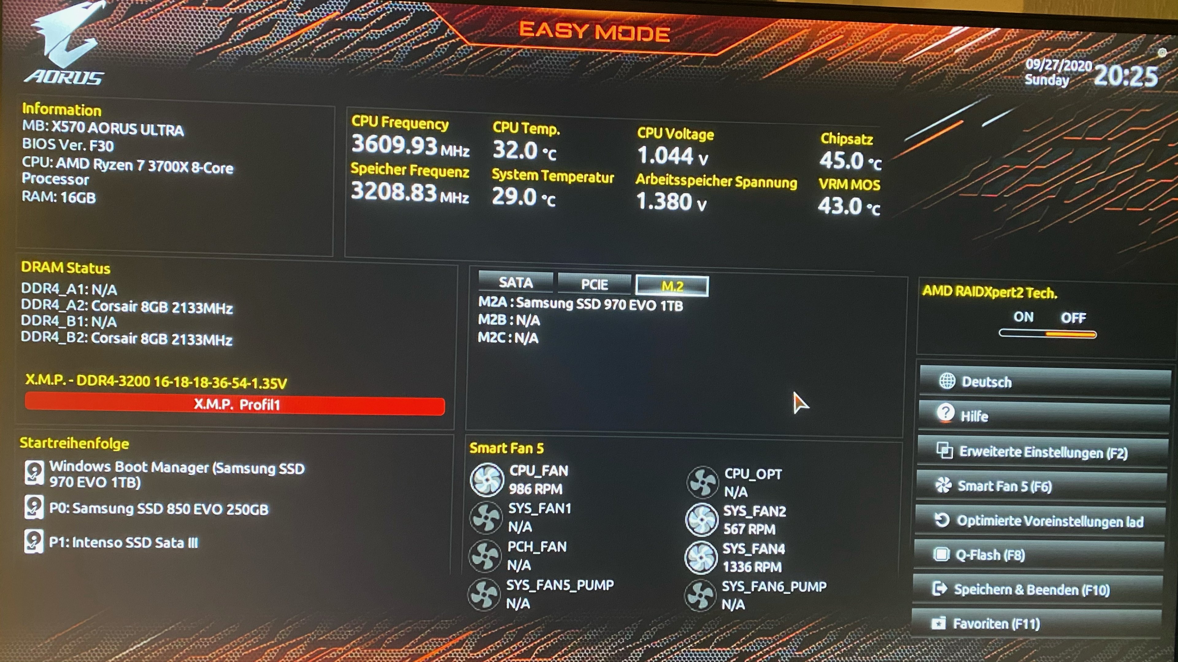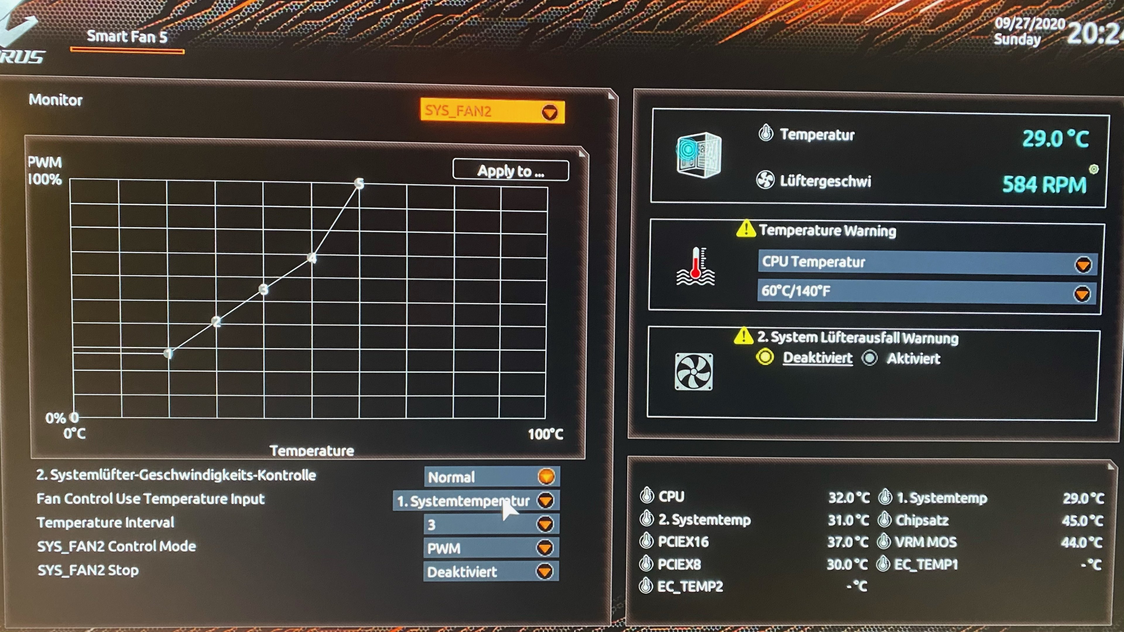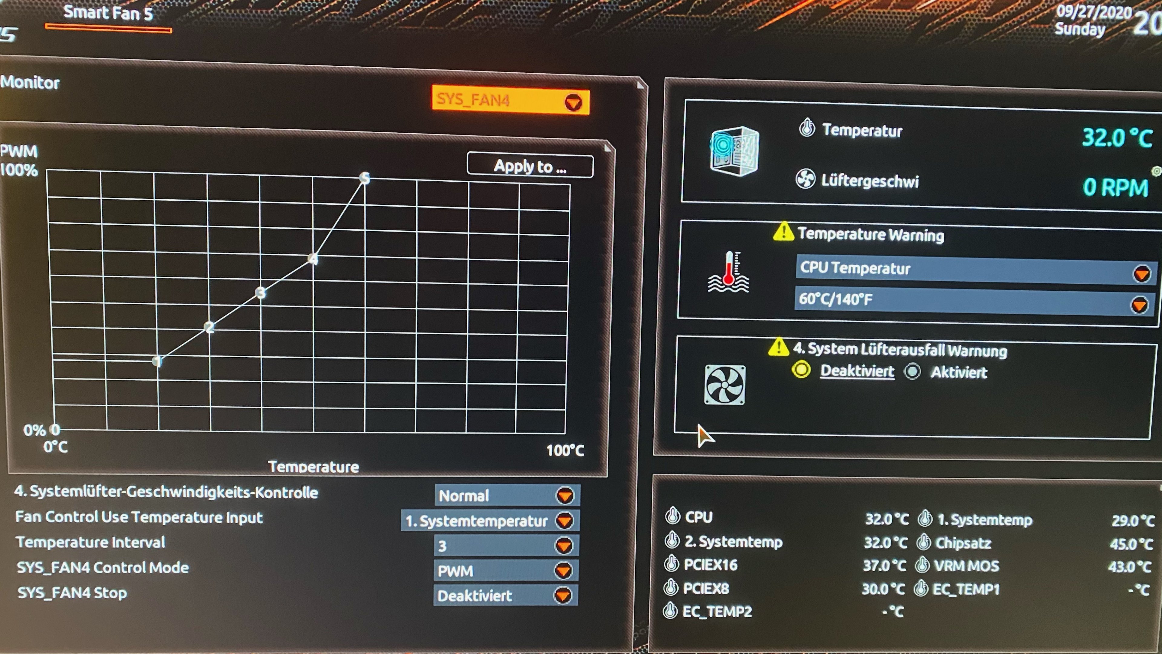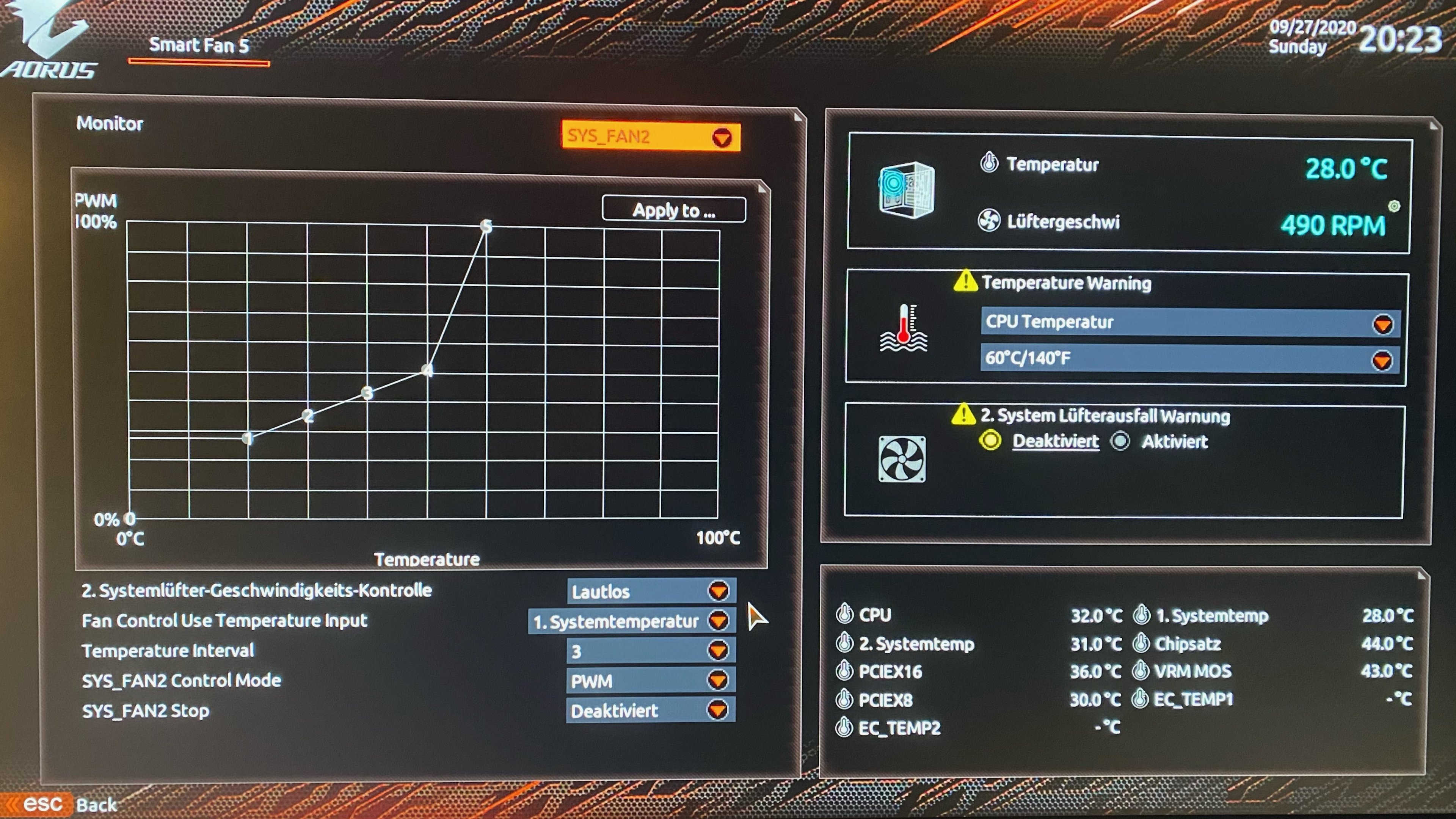 Ich habe heute nach dem Spielen vom neuen Microsoft Flight Simulator bemerkt, dass zwei von den vier Silent Wings plötzlich mit maximaler Drehzahl laufen. Diese laufen auch nur wenn das Profil "Full Speed" eingestellt ist (Smart Fan 5 im BIOS). Sobald ich das Profil Lautlos, Normal oder auch die manuelle Kurve auswähle, so wie sie für alle Lüfter eingestellt ist, stoppen die beiden Lüfter. Diese zwei sind an die 4Pin Anschlüsse Sys_Fan2 und 4 angeschlossen (befinden sich auf der rechten Seite neben dem Arbeitsspeicher). Die anderen 2 Silent Wings welche an Sys_Fan1 und 3 (links oben und unten) angeschlossen sind, lassen sich weiterhin einwandfrei im BIOS über die Lüftersteuerung regeln.