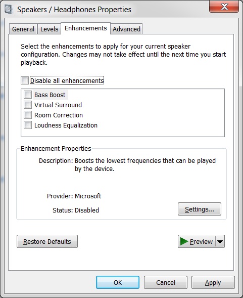 - Control Panel\Hardware and Sound\Sound >> Klangverbieger abschalten deaktivieren (siehe screenshot); HAB ICH