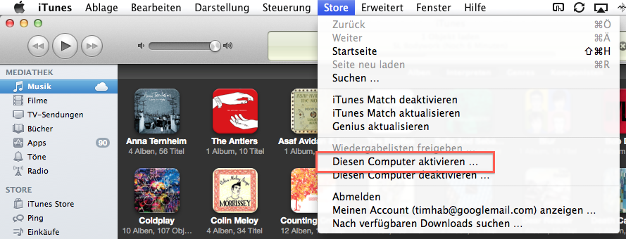 Also geh ich in den Store, kann aber nirgends "Diesen Computer aktivieren" finden. Also gehe ich auf "Account" und finde dort "Computeraktivierungen: Ein Computer ist für die Wiedergabe von Artikeln, die Sie mit dieser Apple ID gekauft haben, aktiviert". Blöd nur, dass ich auch hier keinen Button finden kann um den aktuellen Computer zu aktivieren, beziehungsweise den aktuell aktivierten Computer zu deaktivieren. Verwende iTunes 10.6.1