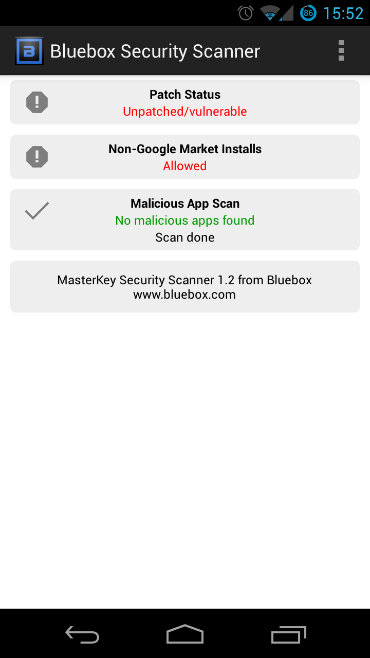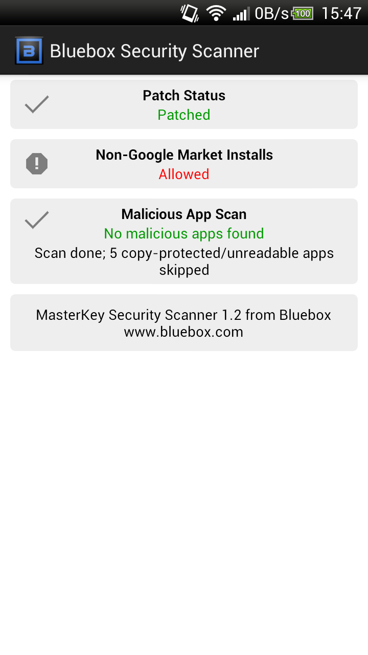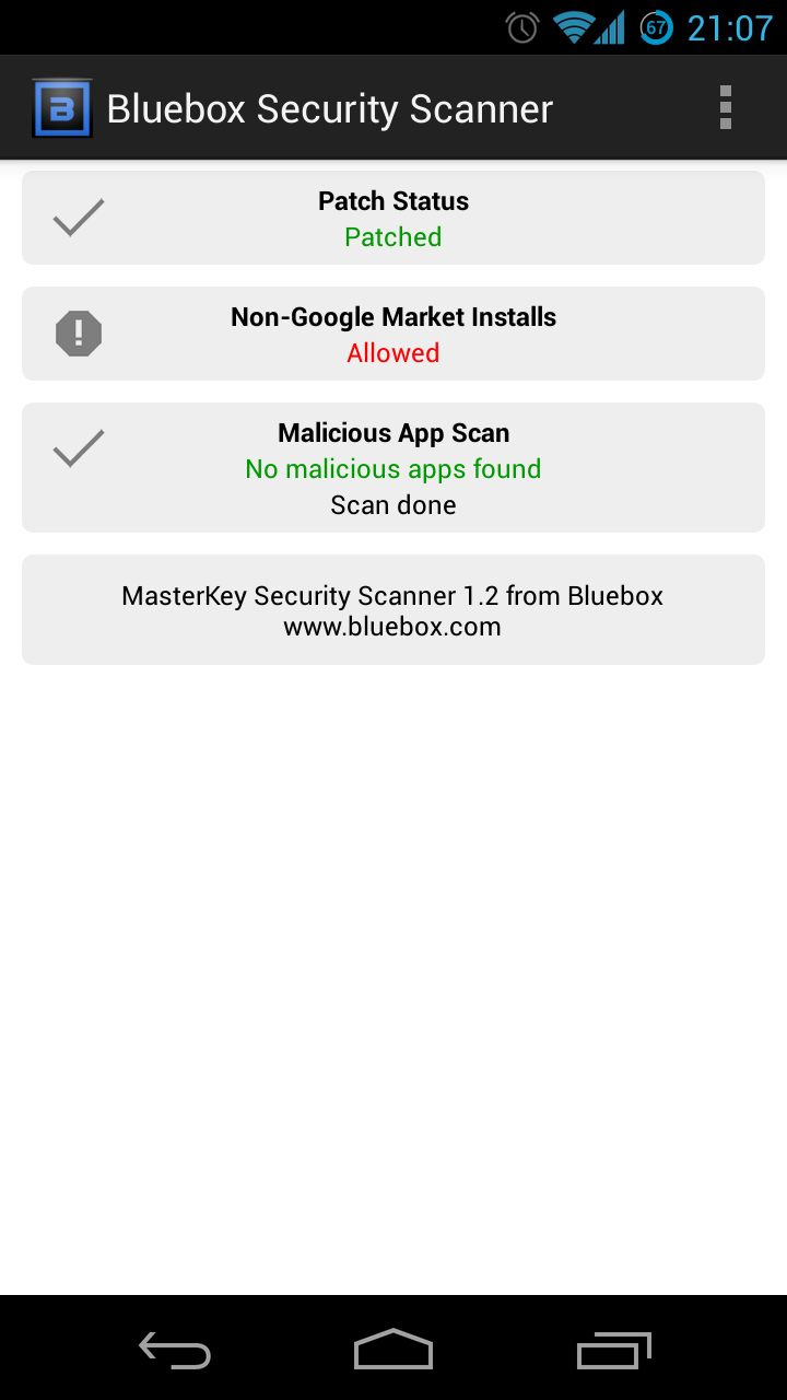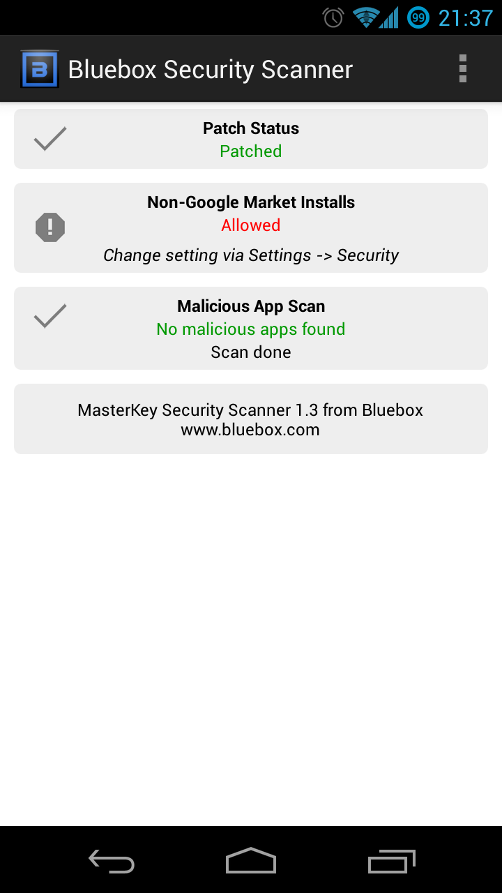 Das Unternehmen Bluebox, das eine schwere Sicherheitslücke auf allen Android-Geräten ab Version 1.6 aufgedeckt hat, stellt über den Play Store eine Anwendung bereit, die Geräte auf die Lücke prüfen kann. Mehr noch: Auch installierte Apps, die die Lücke ausnutzen, werden erkannt.