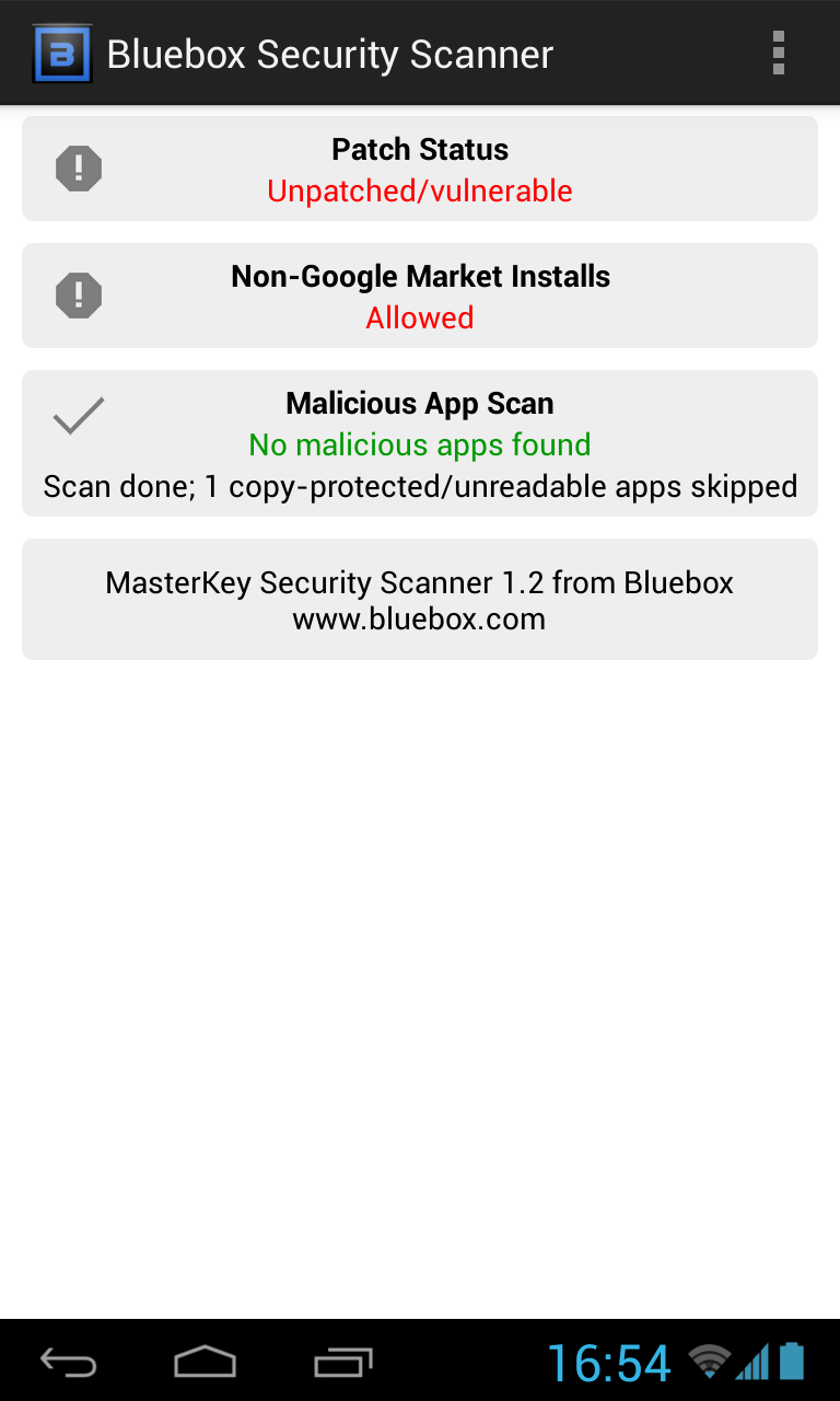 Alternativ wäre es genauso gut möglich, dass die App nicht alles richtig "detektiert", denn ich wage zu bezweifeln, dass die auf allen Geräten mit allen Andoirdversionen geprüft haben, ob, wenn die Lücke nachweislich da ist, diese auch als Lücke erkannt wird^^
