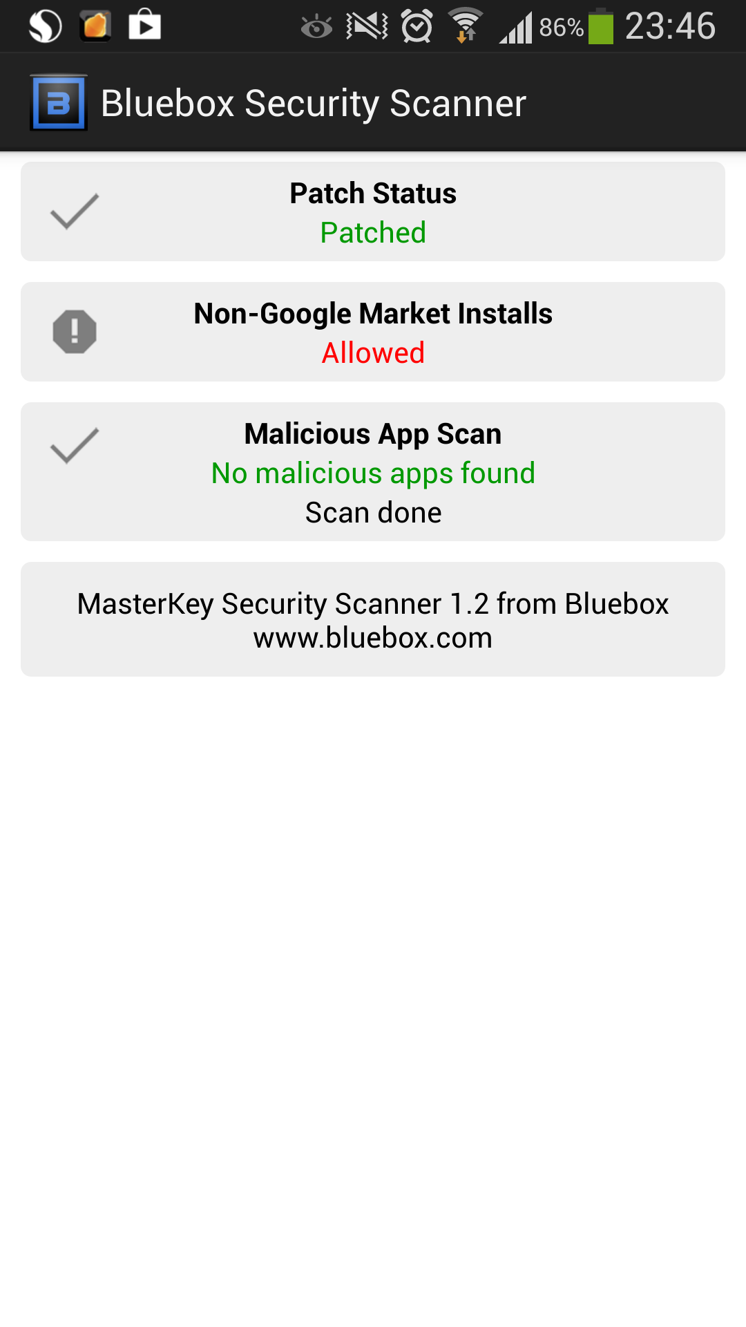 Und genau aus diesem grund postet auch jeder hier sein Ergebnis! In der News stand das ausser dem SGS4 Kein gerät sicher ist! Wie wir nun wissen, danke all den tollen postst hier, sind rund 50-60% (rein geschätzt) der Smartphones im Umlauf sicher! Danke an jeden der sich die App installiert hat und sein ergebnis hier mitgeteilt hat!