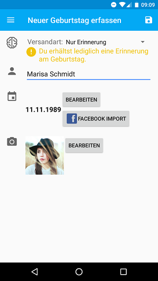 Der Hauptnutzen von BirthdayBrain gegenüber den gegenwärtigen Geburtstagsremindern ist, dass du dir den Zeitpunkt für die Erfassung des Glückwunsches selber aussuchen kannst – wann immer du eben besser und mehr Zeit findest als am Geburtstag selbst!