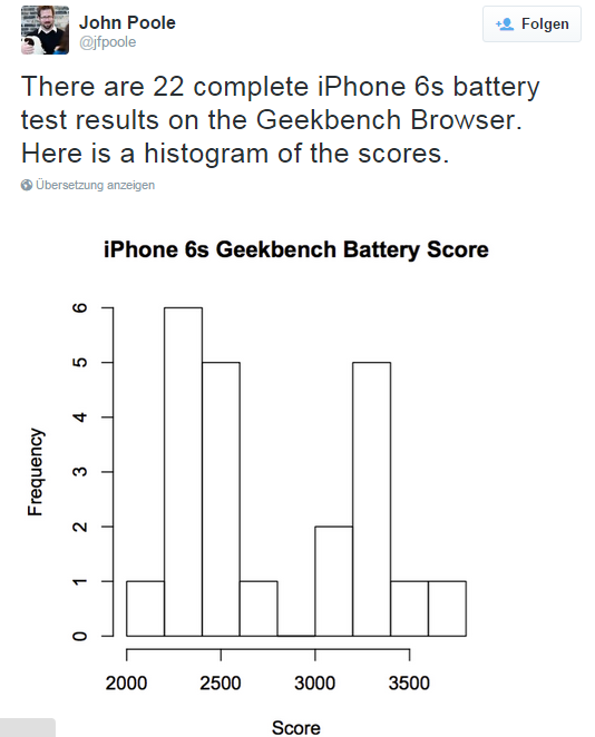 Ich möchte die Existenz eines Unterschiedes nicht leugnen, aber 22 Geräte sind zur Feststellung eines Unterschieds in der Größenordnung von unter 10 % zwischen zwei Gruppen lächerlich klein und vollkommen bedeutungslos. Wäre der Unterschied bei 200% oder größer, dann könnte es reichen. Toll wären die Benchmark-Ergebnisse aller iPhone Nutzer, vielleicht lassen diese sich ja irgendwo abgreifen.