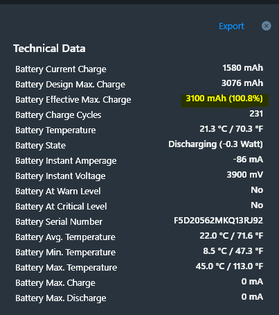 Ich habe leider (natürlich) keinen Screenshot der initialen Werte, aber der bei dieser Abfrage angezeigte Wert für die Battery Effective Max. Charge war damals nochmal deutlich höher. Der aktuell gefühlte Ladestand passt auch nach wie vor zum angezeigten.