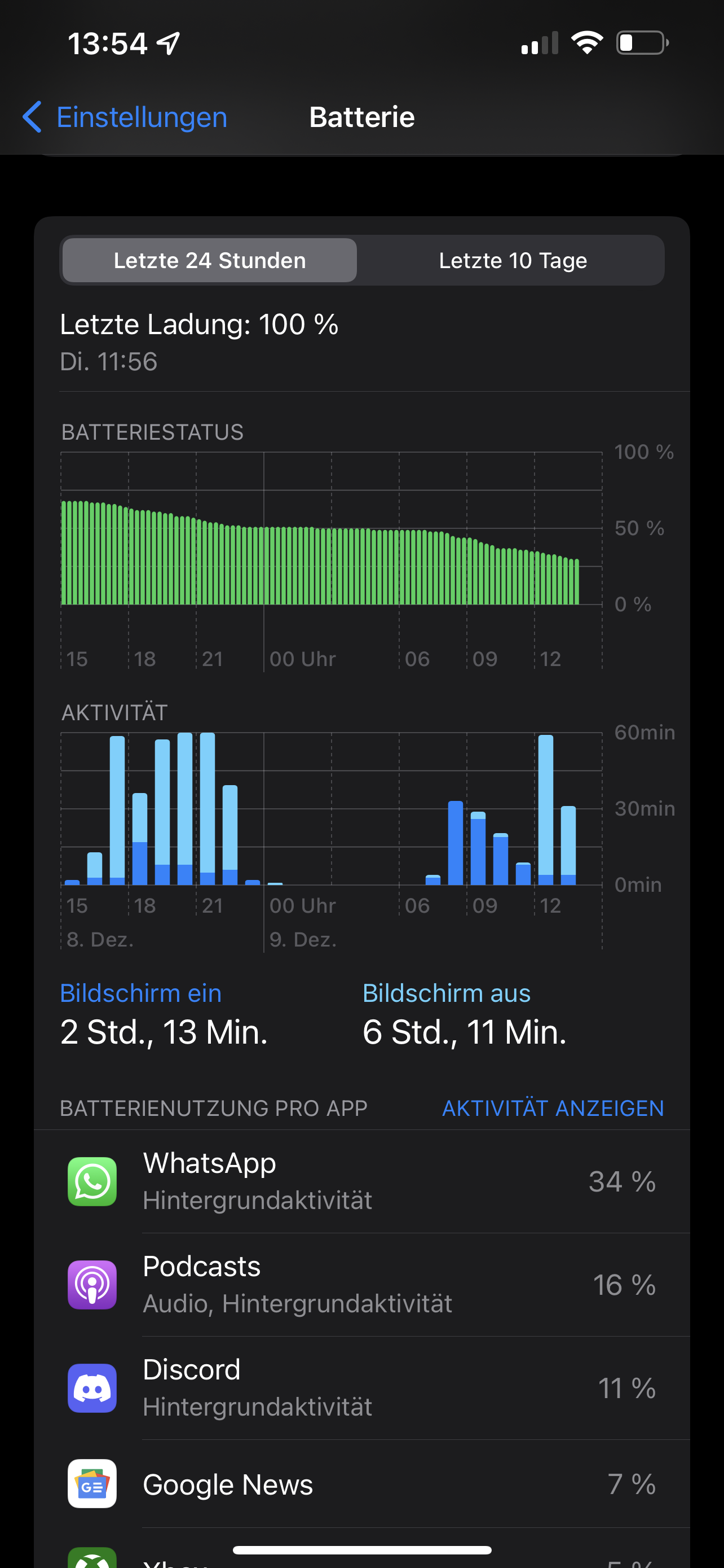 Ich habe Dienstag um 11:56 auf 100% geladen und bin jetzt bei 42% !!! Ich komme damit Locker noch bis Morgen Abend aus dann hab ich 3,5 Tage Laufzeit und ohne extra was auszumachen um Strom zu Sparen,5G, 120HZ und Helligkeit auf 70%. Ich nutze es abends sogar für TeamSpeak bzw Discord.
