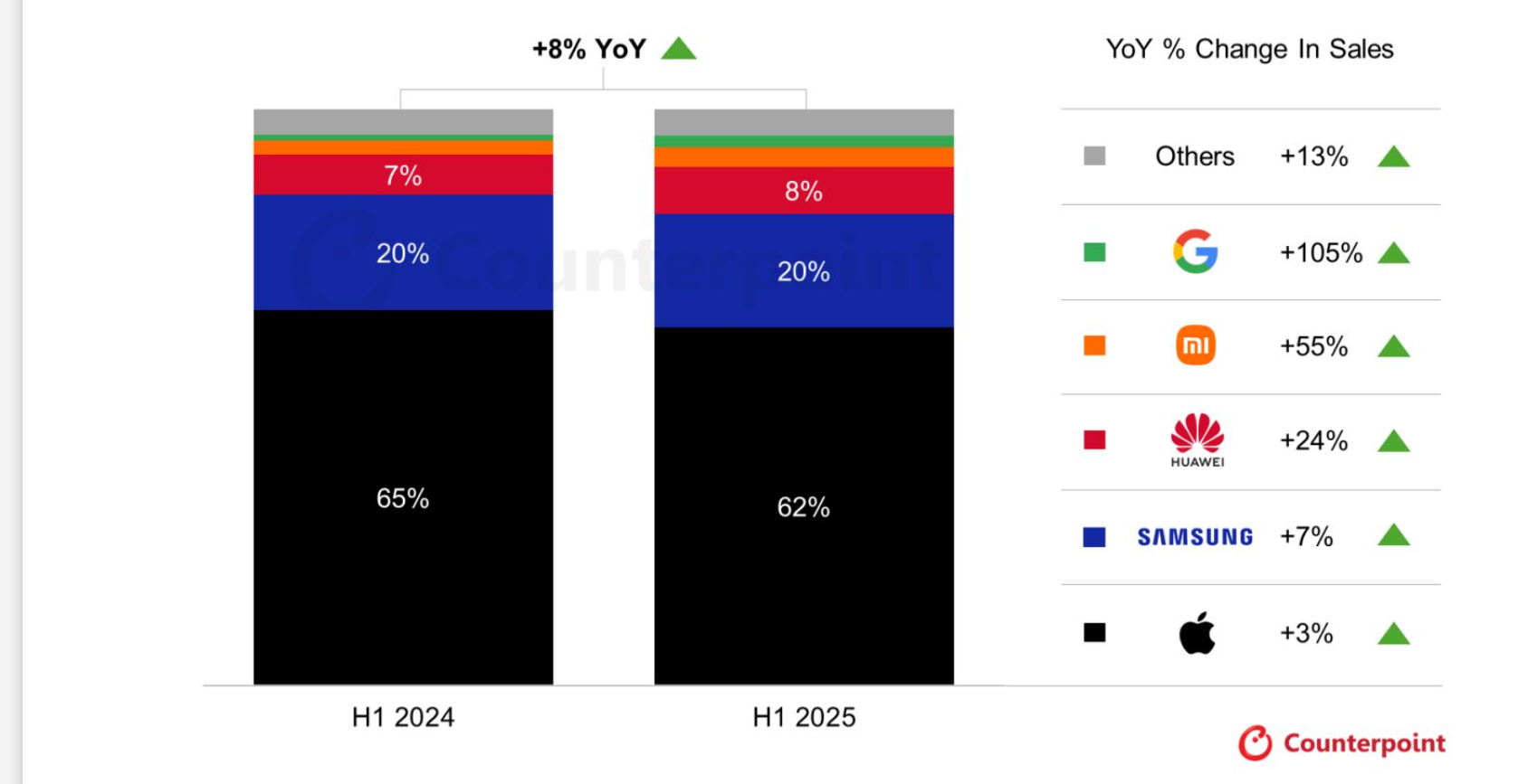 Zitat: Jetzt haben die Marktforscher von Counterpoint Research neue Zahlen für das 1. Quartal 2025 veröffentlicht, die bei Google Pixel sehr gut ankommen dürften.