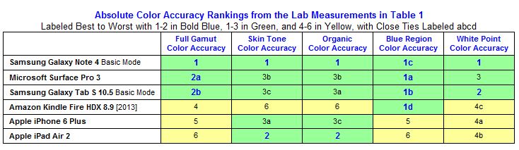 Display Farbwiedergabe von Top Smartphones/Tablets landet das iPhone 6 plus zusammen mit dem iPad Air 2 auf den letzten Plätzen, während das Note 4 deutlich den ersten Platz belegt.