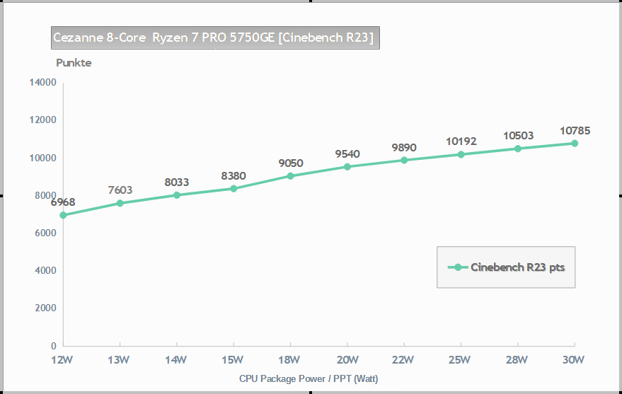 Hier noch die selbstgemessenen Cezanne Einzelwerte von Cinebench 23, falls es das besser verdeutlicht bzw. transparenter macht. Am Ende bei 30 Watt Package Power liegen nach meiner Schätzung also fast 1300 Punkte zwischen Cezanne (~10785 pts) und M1 Pro/Max (~12040 pts).