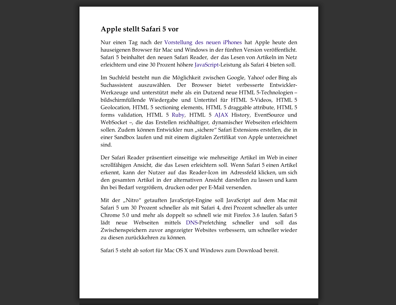 Nur einen Tag nach der Vorstellung des neuen iPhones hat Apple heute den hauseigenen Browser für Mac und Windows in der fünften Version veröffentlicht. Safari 5 soll eine 30 Prozent höhere JavaScript-Leistung als Safari 4 bieten und beinhaltet außerdem den neuen Safari Reader, der das Lesen vom Artikeln im Netz erleichtern soll.