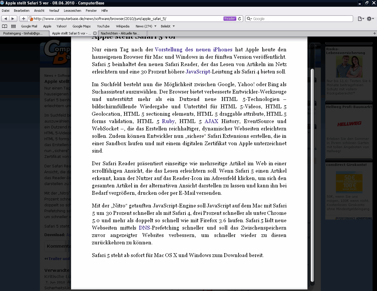 Also die Reader-Funktion gefällt mir richtig gut, insbesondere bei längeren Artikeln. Hier mal am Beispiel der News...