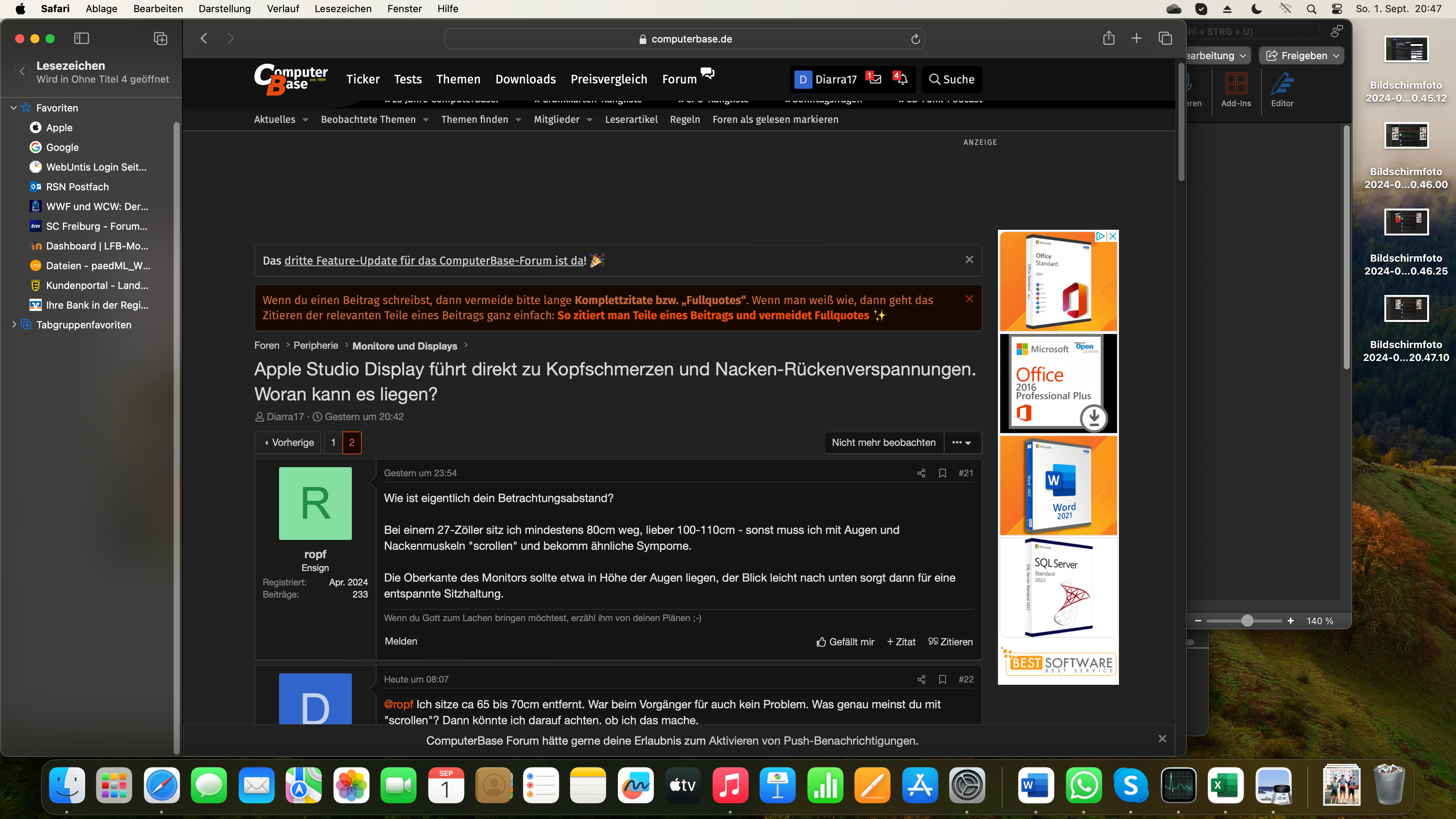 Bei einem 27-Zöller sitz ich mindestens 80cm weg, lieber 100-110cm - sonst muss ich mit Augen und Nackenmuskeln "scrollen" und bekomm ähnliche Sympome.