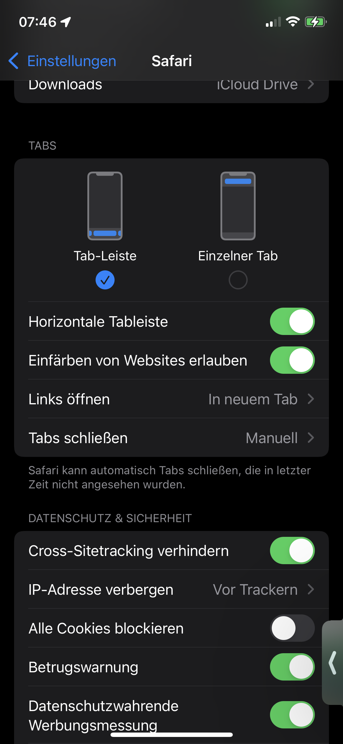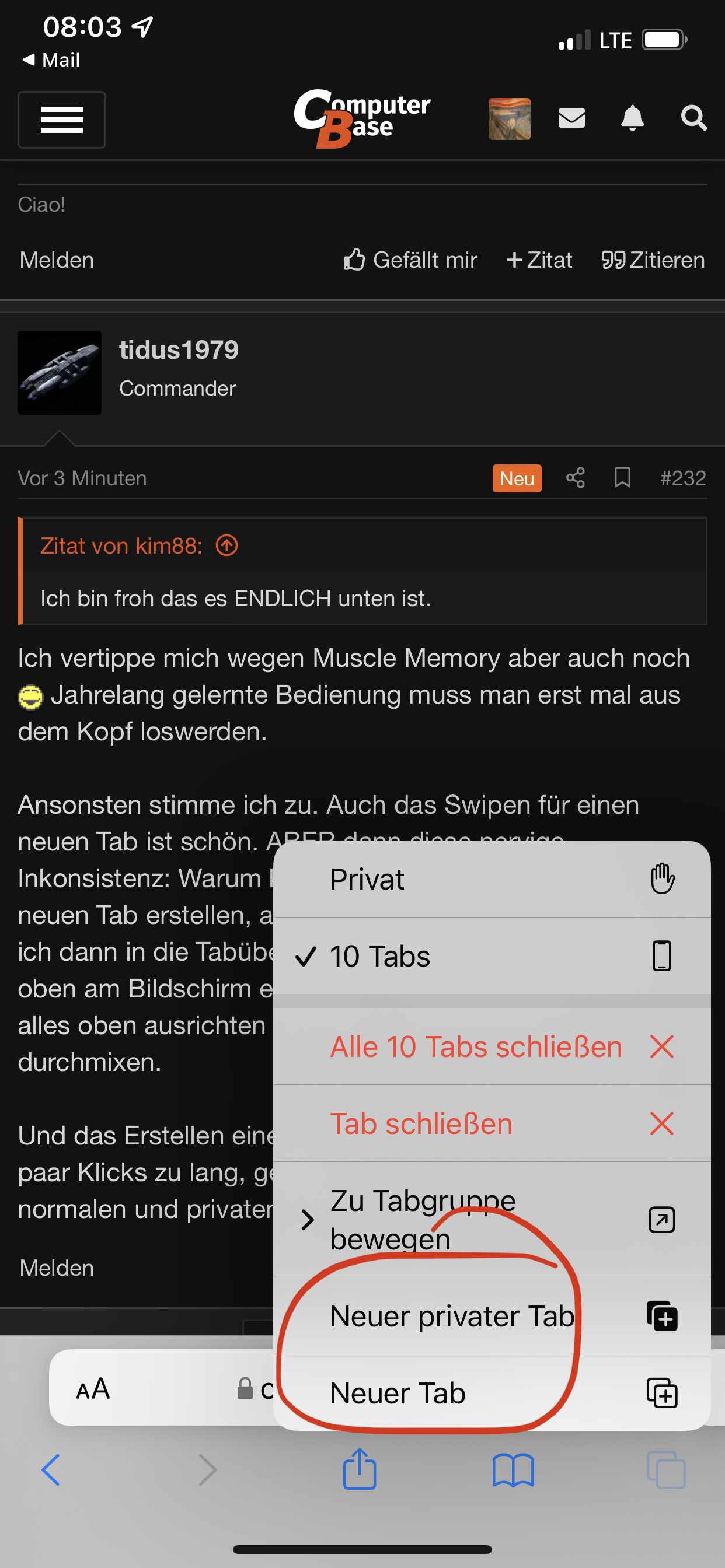 Wenn du mehrere Tabs geöffnet hast, ist der letzte Tab in der Tabübersicht immerhin unten.tidus1979 schrieb:Ansonsten stimme ich zu. Auch das Swipen für einen neuen Tab ist schön. ABER dann diese nervige Inkonsistenz: Warum kann ich so schön einfach einen neuen Tab erstellen, aber zum löschen eines Tabs muss ich dann in die Tabübersicht und dann doch wieder ganz oben am Bildschirm ein kleines x treffen. Nervig. Entweder alles oben ausrichten oder unten, aber bitte nicht so durchmixen.