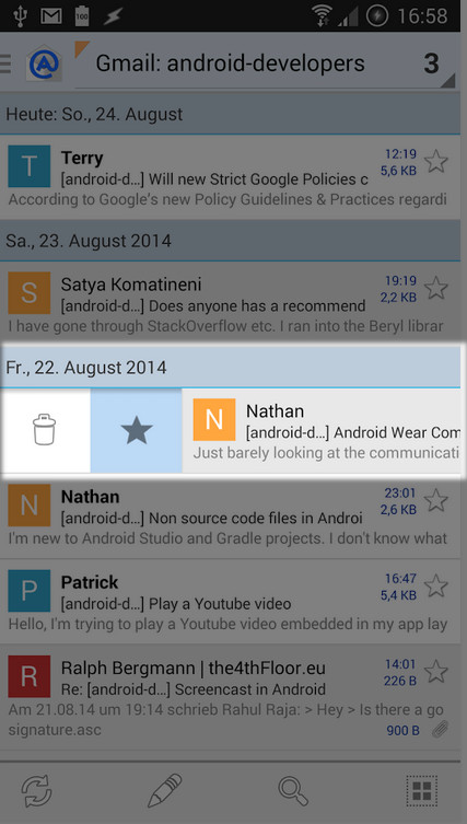 Also ich kann bei AquaMail nichts wischen.... ich kann die Mails anklicken (lange gedrückt halten), bis sie ihre Farbe verändern und als markiert gelten.