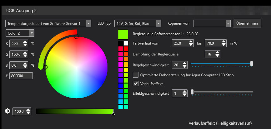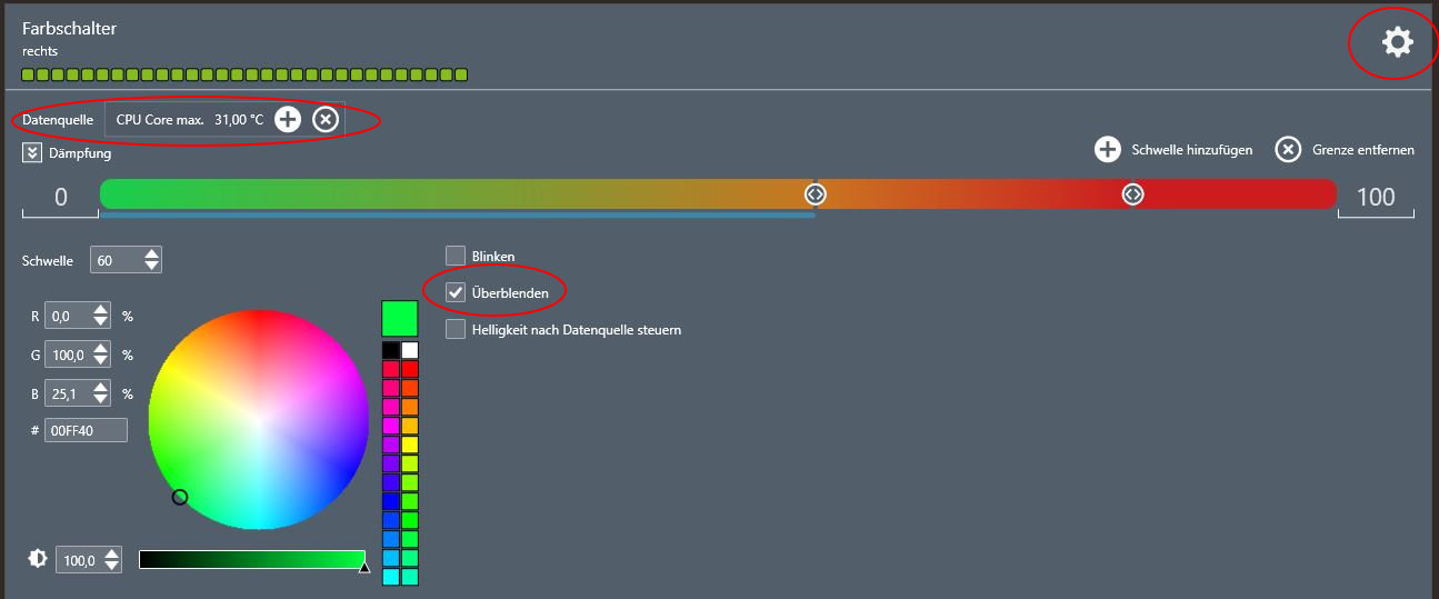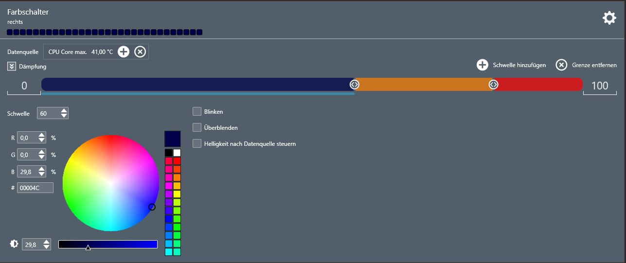 Jetzt hätte ich gerne einen Farbverlauf von "grün nach rot" erstellt, der mit die aktuelle Temperatur der CPU visuell darstellt.