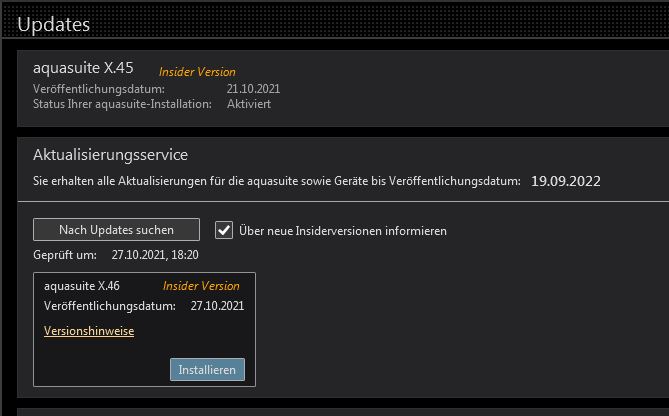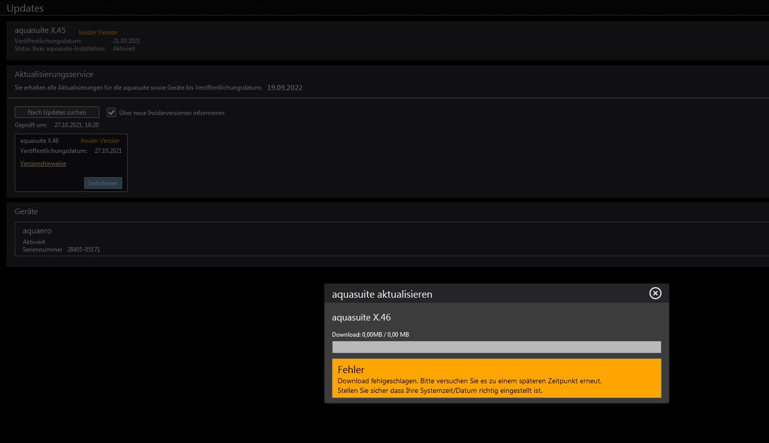 1. beim Starten der Aquasuite sagt er mir dass es ein Update gibt. Wenn ich auf installieren klicke bekomme ich aber jedes Mal eine Fehlermeldung die besagt dass die Uhrzeit nicht mit der Uhrzeit des Systems übereinstimmt und das Update deshalb abgebrochen wird.