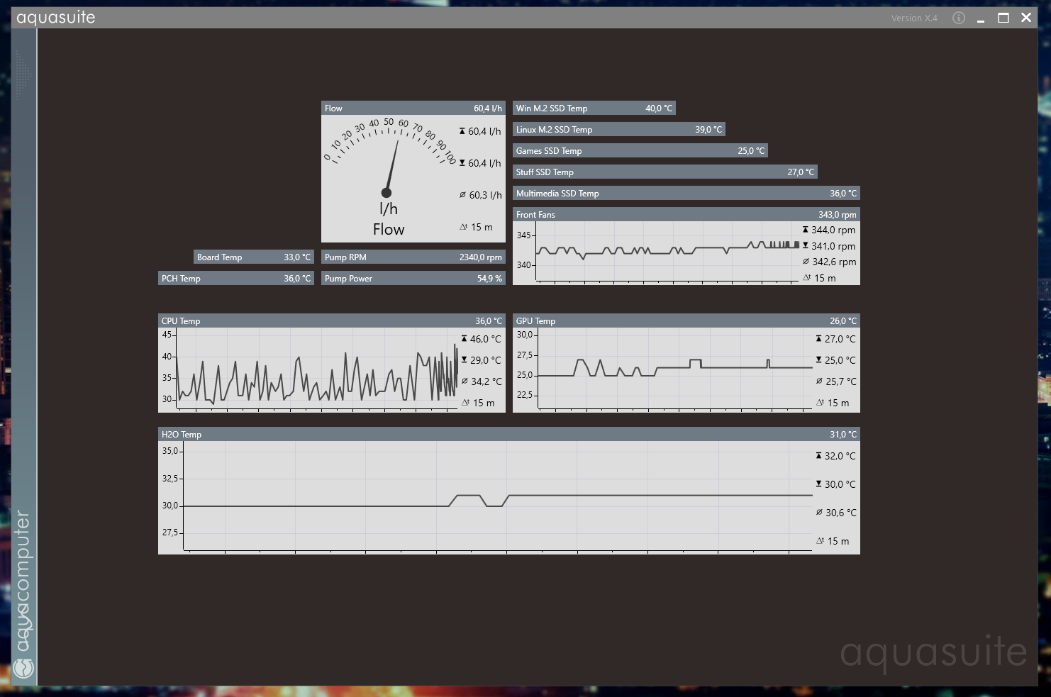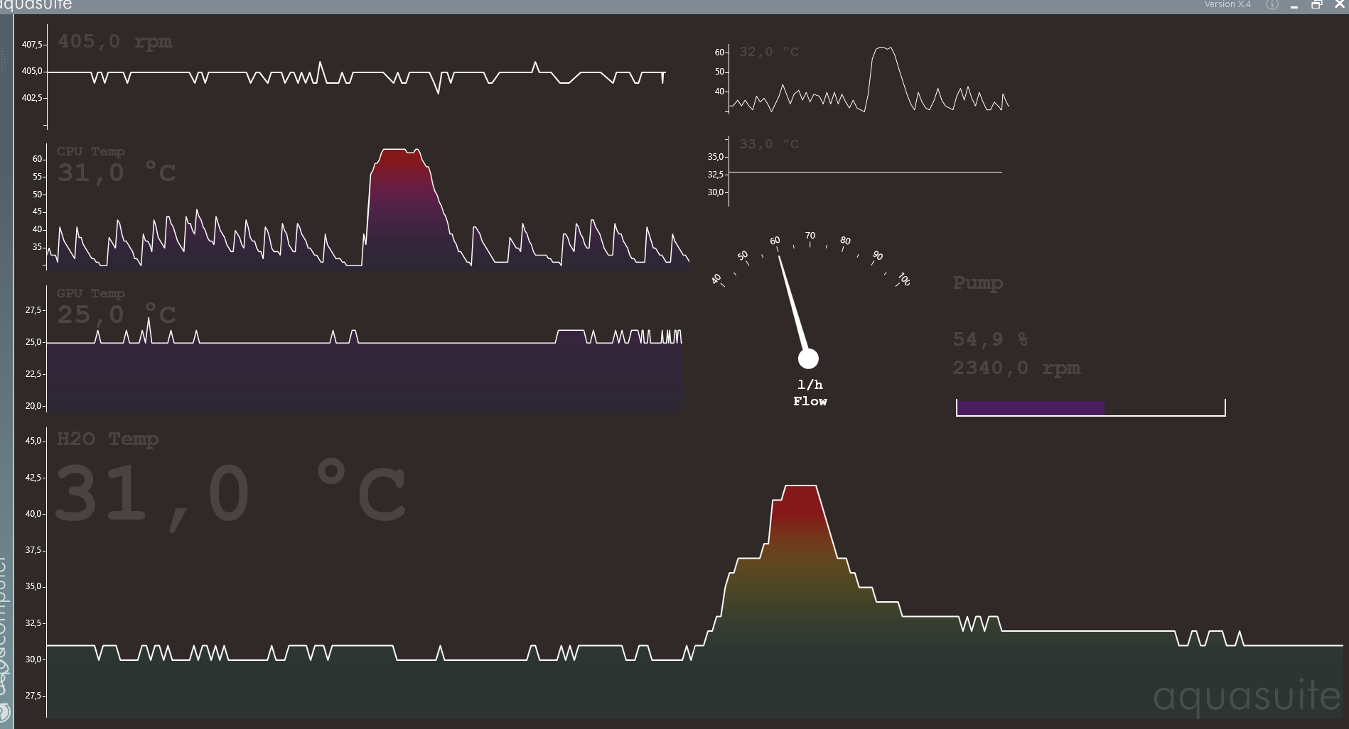Ich habe bei mir nur die wichtigsten Temperaturen im Blick (Wasser, CPU, GPU, GehÀuseabluft) und dann noch den Durchfluss.
