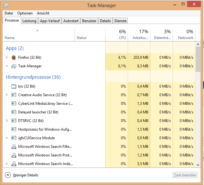 Sobald ich den Computer starte fängt die Auslastung des RAMs an sich in die höhe zu schrauben (beginnt bei etwa 15% danach etwa 1 % alle 30 sekunden)