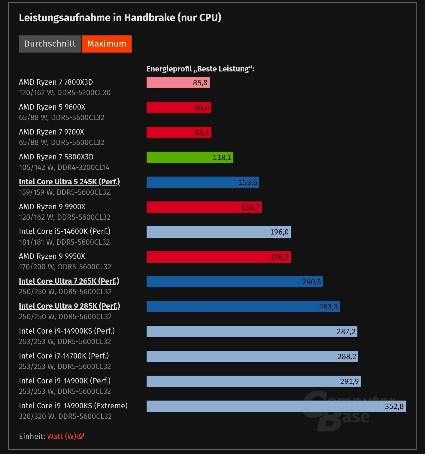 Beim 265K empfiehlt es sich entweder direkt im BIOS oder mittels Intel XTU die MTB (Maximum Turbo Boost/Power) von 250W auf die PBP (Processor Base Power) von 125W zu reduzieren und bei vorhandenem Z-Chipsatz zu undervolten.
