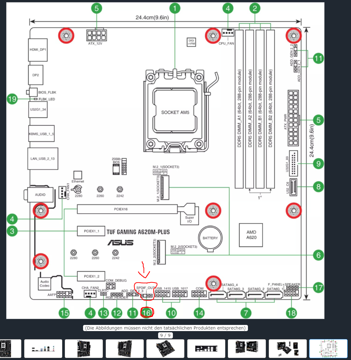 Irgendwas stimmt mit dem Mainboard nicht. Auf der Geizhals-Seite und in dem Datenblatt ist S/PDIF aufgeführt, aber auf den Fotos gibt es dafür keinen ausgang.