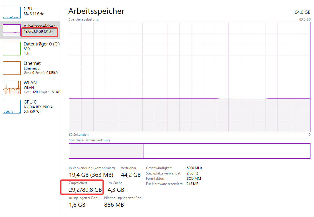Sehe ich das richtig: meine Programme incl. Windows belegen 19,4 GB im Ram und 29,2 GB wurden schon ausgelagert. Wäre also alles im Ram 19,4 GB + 29,2 GB = 48,6 GB >>> Ram fast voll, Windows, bzw. die Programme schmeisen Daten auf die SSD. Aber warum schiebt Windows nicht wieder Daten zurück in den Ram? Aktuell ist ja wieder knapp 69% Ram frei.