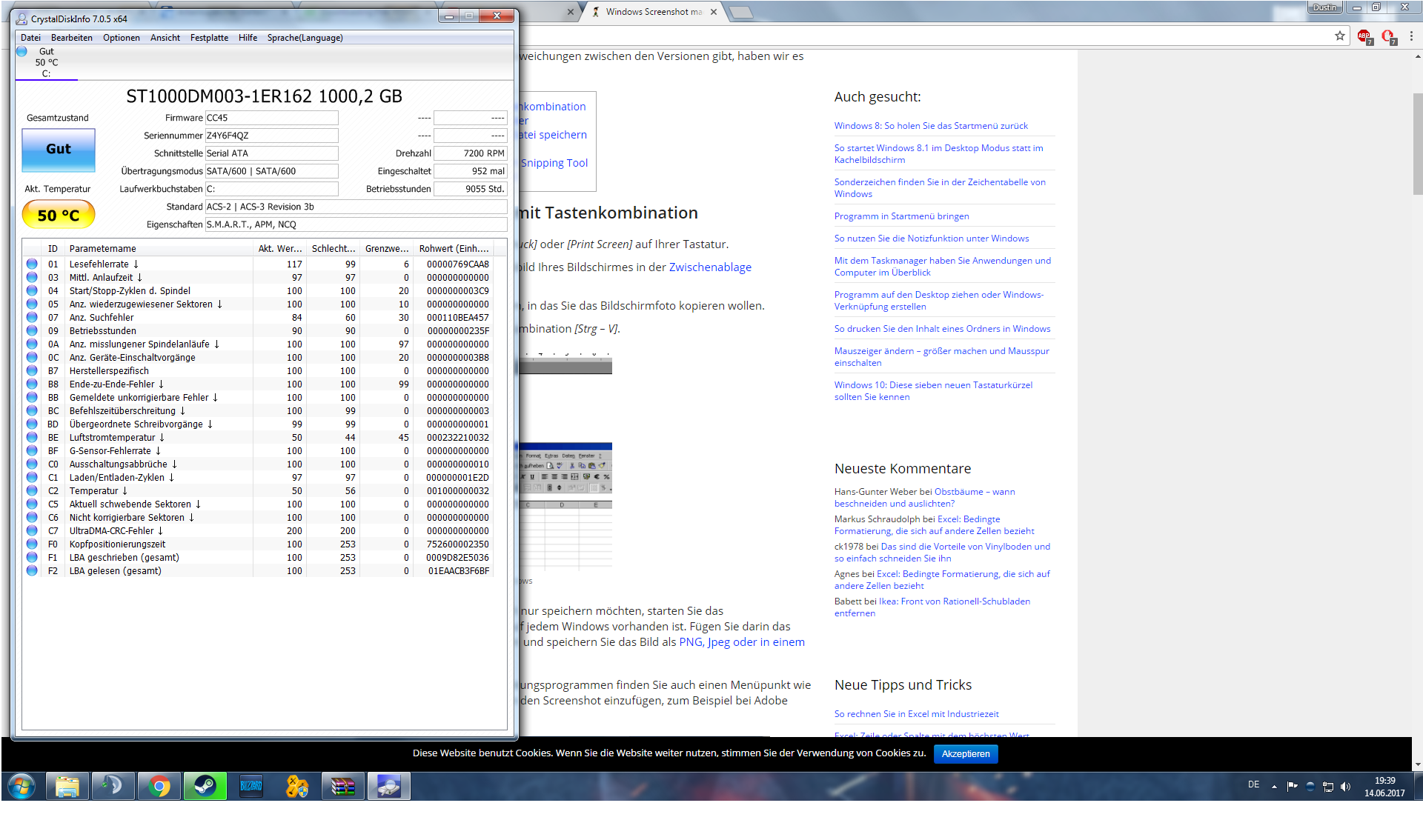 Poste doch bitte mal die Screenshots von CrystalDiskInfo für alle internen HDDs und SSDs, ziehe aber bitte das Fenster soweit auf, dass alle Attribute und auch die Rohwerte vollständig sichtbar sind, also keine Scrollbalken mehr erscheinen. Bitte machen den Screenshot aus Windows und nicht mit einer Kamera vom Bildschirm und nur den Screen von CrystalDiskInfo, mit Alt+Druck erzeugt Windows einen Screenshot des aktiven Fensters in der Zwischenablage.