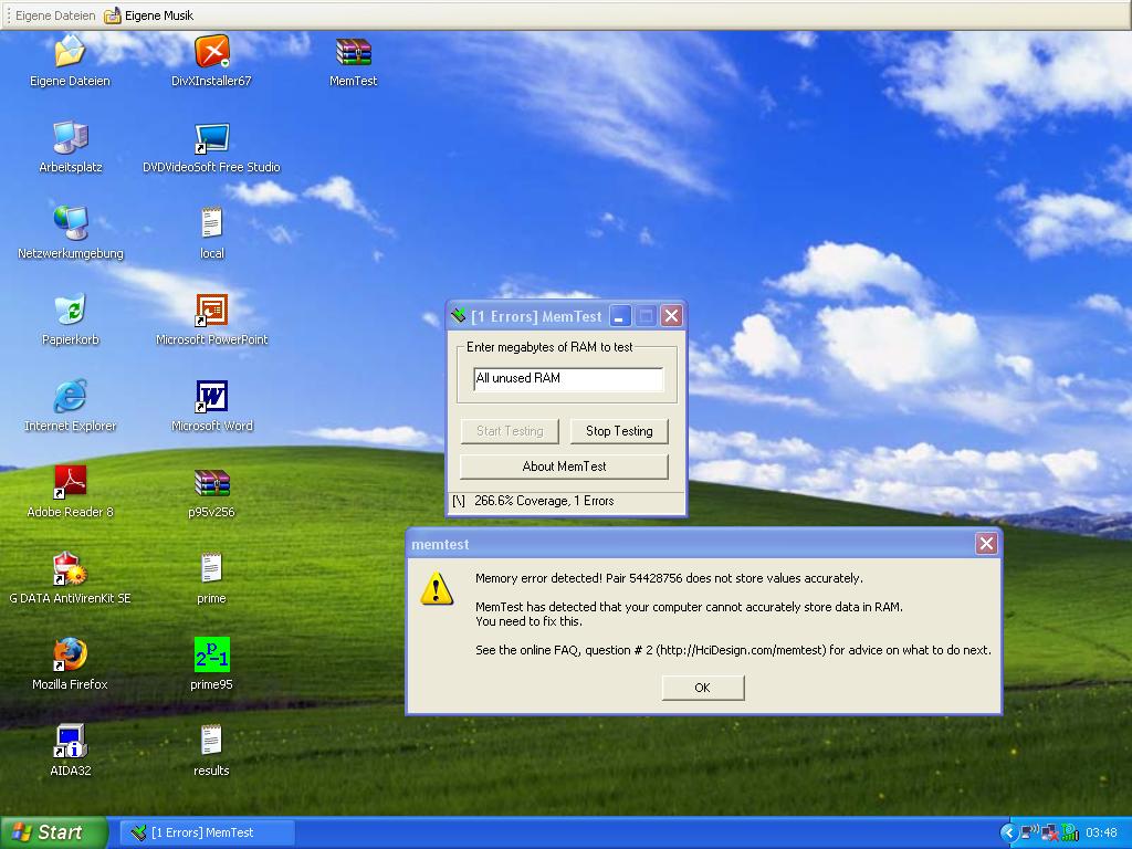 Hab Prime95 laufen lassen und Memtest, Memtest hat zwei Fehler gefunden, siehe Screen.