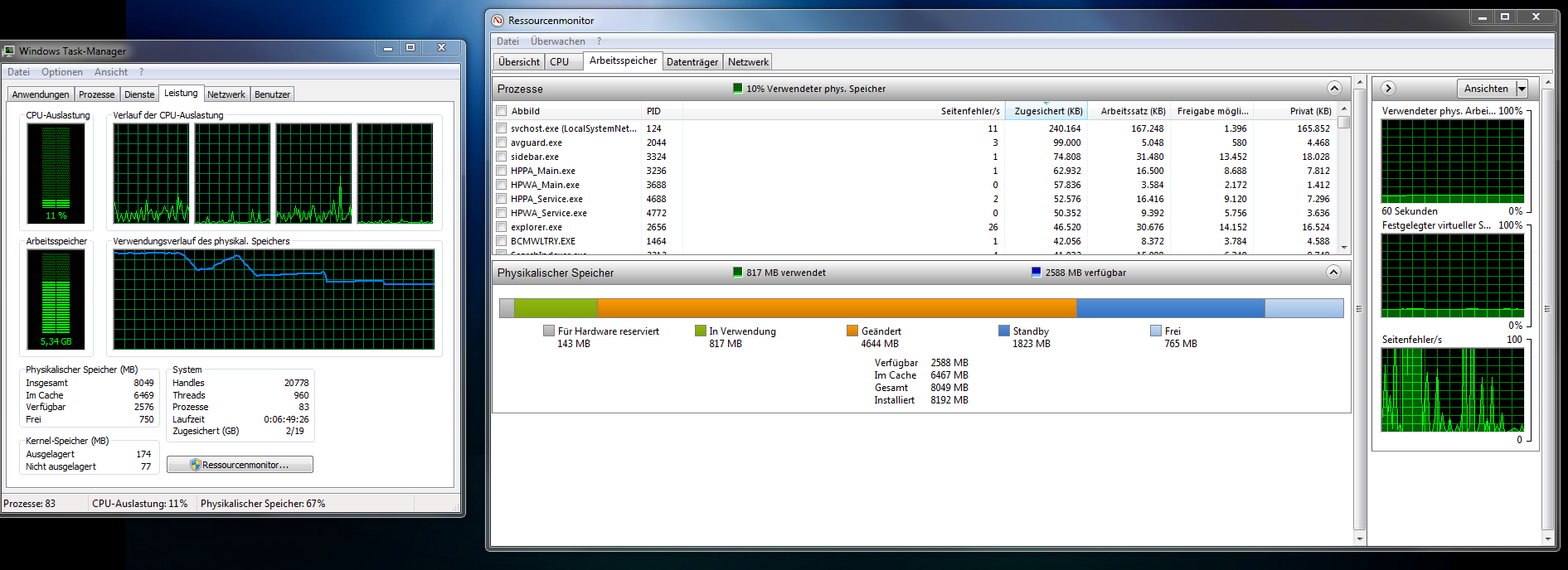 Nun ist es so, dass mir der Arbeitsspeicher trotzdem voll läuft. Wenn ich mir im Resourcemonitor von Windows7 Professional 64bit angucke, was da los ist, sehe ich, dass der Teil "geändert" massiv ansteigt und den ganzen physikalischen Arbeitsspeicher füllt.