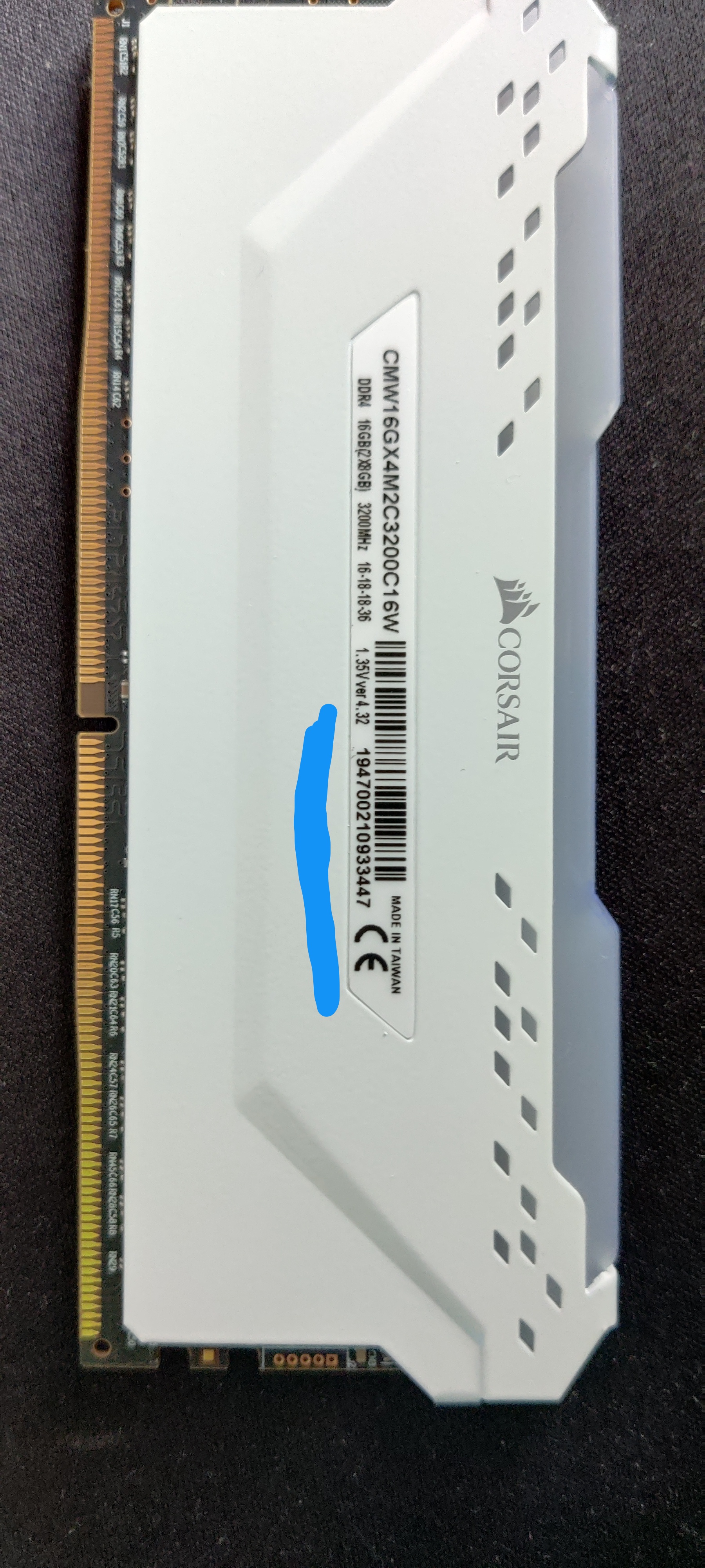 da ich mit meinen 16GB RAM beim Videoschnitt immer wieder an Grenzen gestoßen bin, habe ich mich entschlossen mal auf 32GB abzugraden. Verbaut ist der Corsair Vengance Pro RGB mit jeweils 8GB (also insg. 4x8GB). Ich habe beide im 16Gb Kit gekauft und beide sollen auf 32000mhz CL16-18-18-36 laufen. Das tun beide auch, aber leider nur, wenn sie im Slot 2&4 sitzen. Wenn ich also zu meinen vorherigen 16GB weitere 16GB in Slot 1&3 (sodass alle 4 Slots belegt sind) stecke, lässt sich das XMP Profil nicht aktiviern bzw. es läuft nicht. Aktiviere ich es, startet der PC nicht und startet nur neu aber ohne Bild. Auffällig ist, dass aber beide (unabhäning voneinander) in Slot 2 &3 prima im aktivierten XMP profil laufen. Es sind beides 1:1 die gleichen Kits, infos dem Bild zu entnehmen, nur die Nummer unter dem Strichcode unterscheidet sich natürlich (Blau Makiert). Hier die daten des PCs: