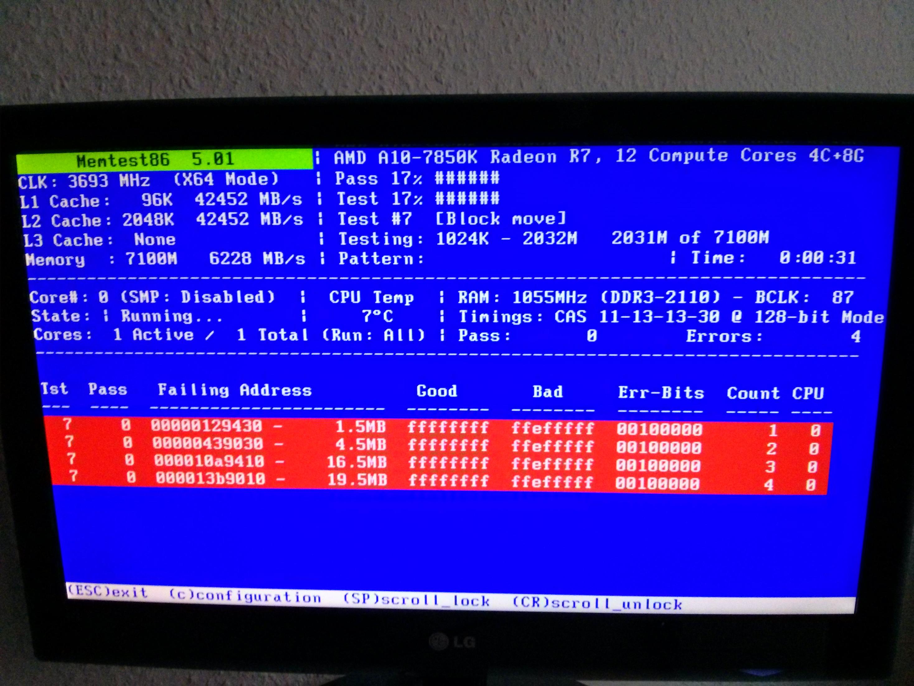 ich habe mir in den vergangenen Monaten ein neues System zusammengebaut. Und zwar handelt es sich um ein "kleines Kaveri-System". Es läuft soweit auch alles stabil. Die Komponenten habe ich damals so gekauft, dass sie die iGPU nicht ausbremsen. Bei dem RAM fängt das Ganze ja an. Der Kingston Hyper X Predator besitzt zwei XMP: 2133mhz und 2400mhz, er ist also auf 2400mhz spezifiziert. Von Übertakten kann hier also nicht die Rede sein. Lasse ich den RAM nun auf dem 2133mhz-Profil laufen, so bleibt das System stabil, nehme ich das 2400mhz-Profil (ich habe die Timings manuell eingestellt, da in der Anleitung steht, dass die Unterstützung von 2400mhz-Riegeln nur im OC erfolgen kann! dabei natürlich die Werte, die vom XMP vorgegeben sind) so führt das beim RamTest86 Test Nr. 7 zu Fehlern! Das System ist instabil. Bevor ich mich bei euch gemeldet habe, bin ich in diversen Inet-Foren herumgestolpert und habe versucht eine Lösung zu finden. Im Bios habe ich gefühlt tausendfach unterschiedliche Timings eingegeben, aber die Riegel laufen einfach nicht stabil! so ein Dreck Mit meinem Latein bin ich am Ende.