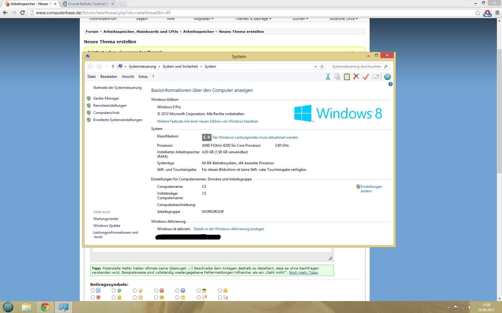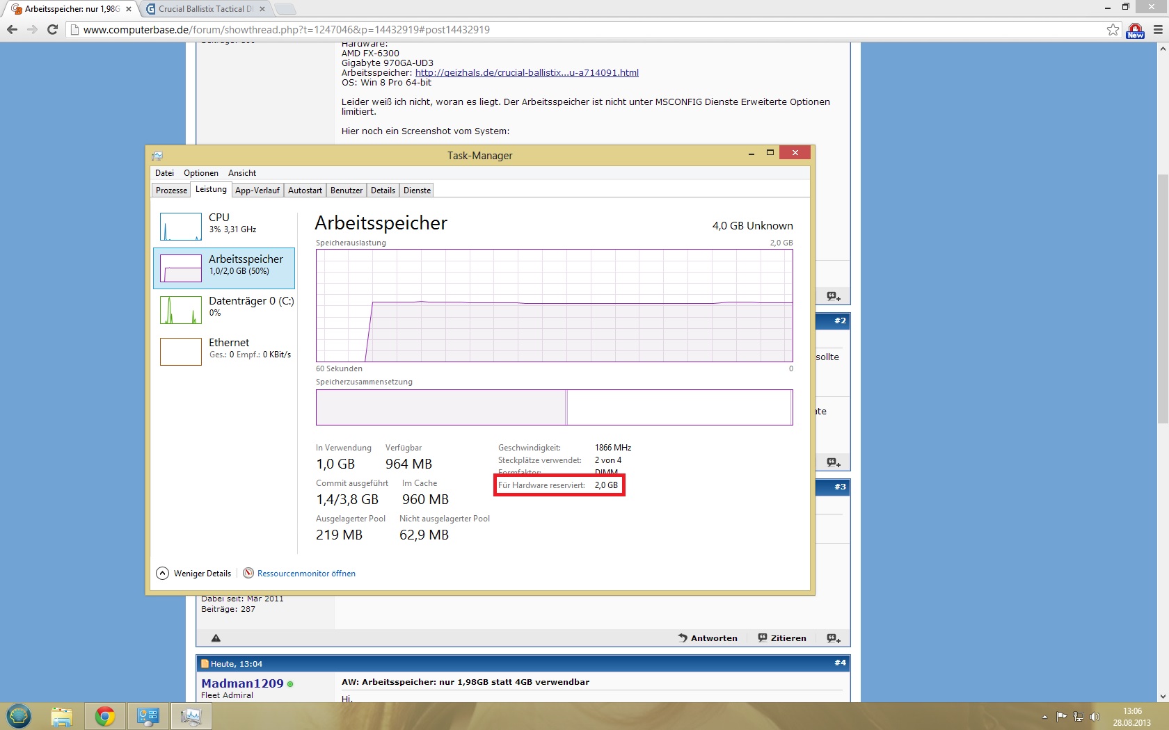 bei mir sind 1,98 GB statt 4 GB Arbeitsspeicher verwendbar.