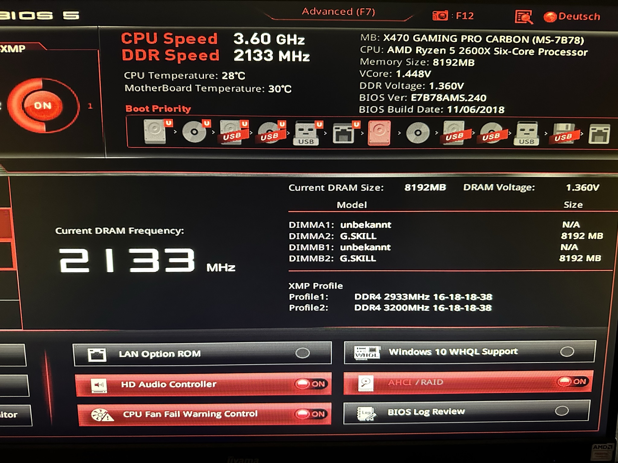 Als ich im Bios geschaut habe, wurde ich etwas stutzig. Dort wurden zwar beide Riegel angezeigt, aber als Gesamtspeicher nur 8GB.