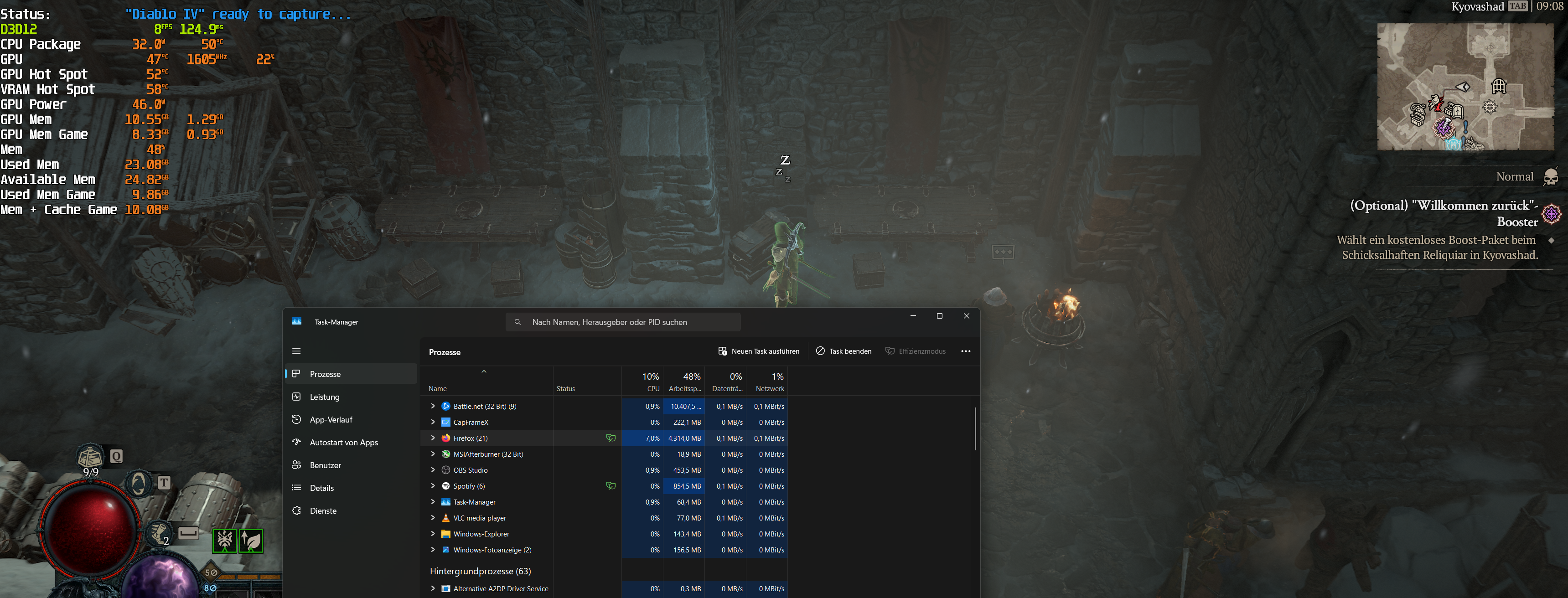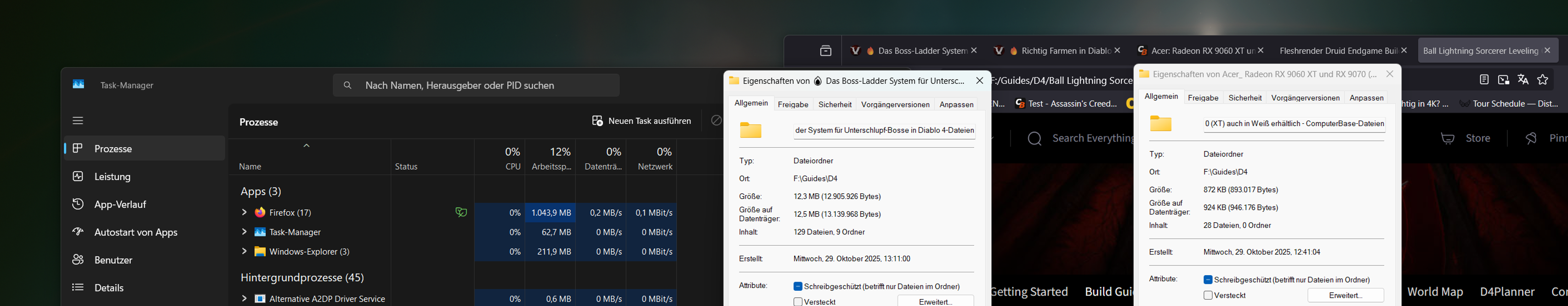 Das ist auch bei mir eine gängige Kombi (D4 + Firefox mit massenhaft Tabs, davon einige D4-Builds). Aber komischerweise funzt das mit 32 GB noch gut bei mir.Pheenox schrieb:weil Diablo 4 zusammen mit den Build-Guides Seiten einfach mal mir nichts dir nichts locker die 32 GB voll gemacht hat. Nachdem ich dann 64 GB hatte hab ich gesehen, dass es in der Spitze bis zu 38 GB RAM waren, die diese Kombi verschlingt.